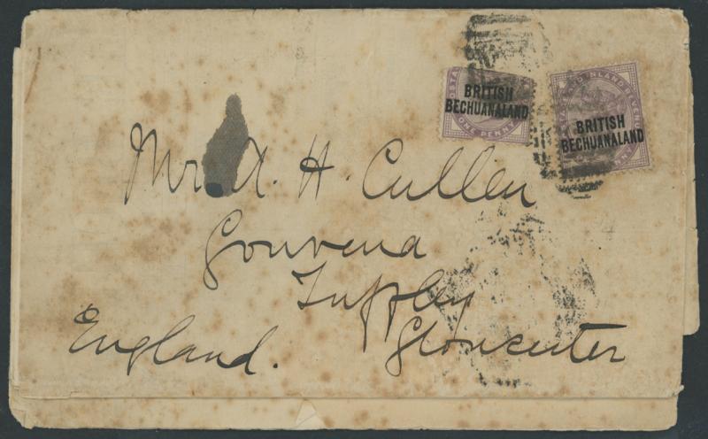 2d (perf damage at left) tied by very fine '638' cancel and 'MAFEKING/BECHUANALAND' cds alongside, double-circle 'CAPE TOWN' arrival backstamp, light but clear 'ADVERTISED/AND/UNCLAIMED' handstamp on the face & partial RLO backstamp, flap-tear. Ex