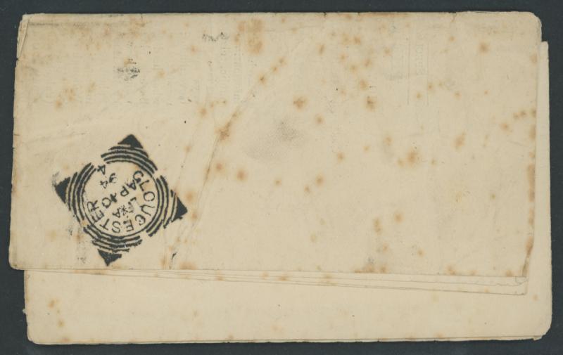 to England with Overprints 1d lilac x2 (one bisected?; not listed by Gibbons) tied by poor numeral cancels, superb 'GLOUCESTER/AP10/94/ 4 ' squared-circle arrival backstamp, spotty and fragile with some separation along the folds. (Image1) (Image2)