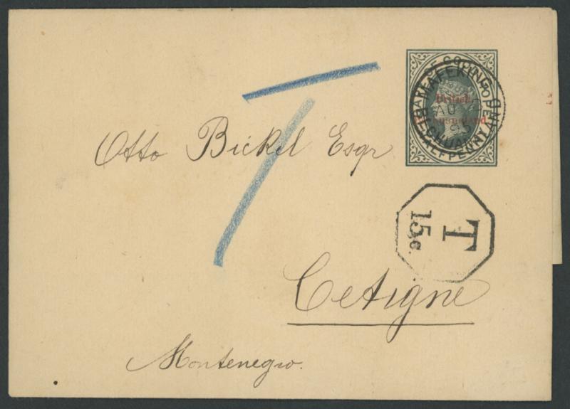 1895 (Aug) usage of Cape of Good Hope ½d Wrapper with tiny 'British/Bechuanaland' Overprint in Red to Montenegro with "T" in blue
