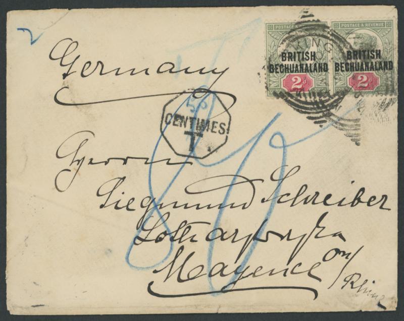 1894 (Dec) cover to Germany with overprinted Jubilee 2d pair tied by 'MAFEKING/B.B' squared-circle, '("50")/CENTIMES/ T