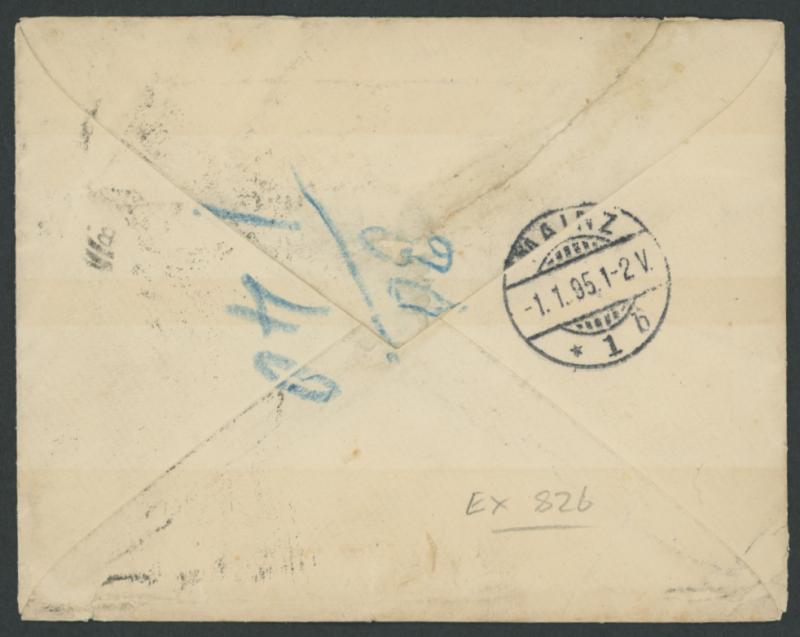 '-in-octagon of Cape Town, 'MAINZ/1.1.95' (New Year's Day) arrival backstamp & endorsed "80" in blue pencil, repaired flap fault.
