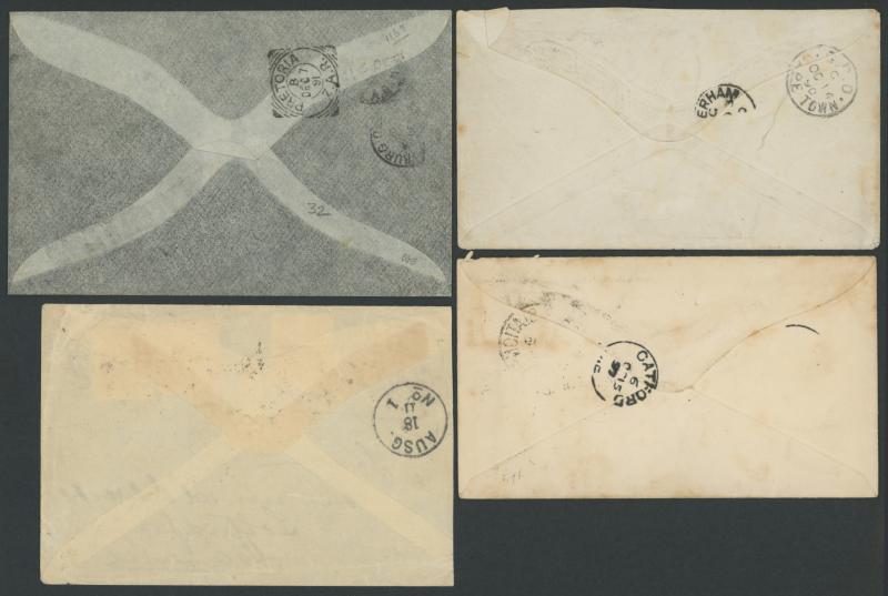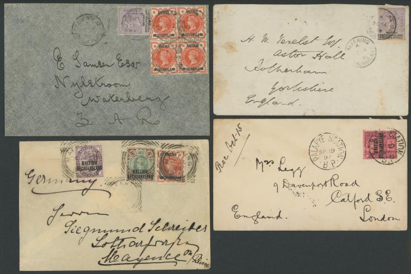 'MIDLAND/DOWN' transits; 4) 1894 to Germany with Overprints ½d 1d & 2d tied by 'MAFEKING/B.B.' squared-circles; and 5) 1897 to England with Overprints 6d tied by very fine 'PALAPYE STATION/BP' cds; some mostly minor blemishes.