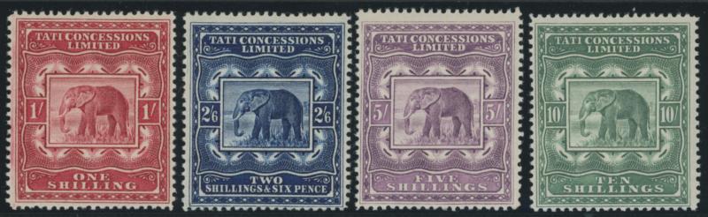 REVENUES: Tati Concessions 1896 Elephant 1/- to £5 set Barefoot 1-6, generally well-centred especially the £1 & £5, a couple of