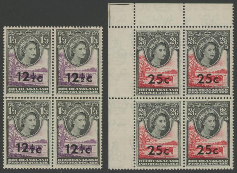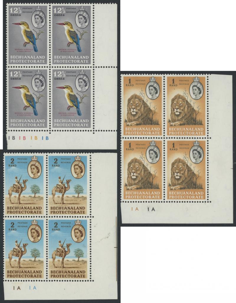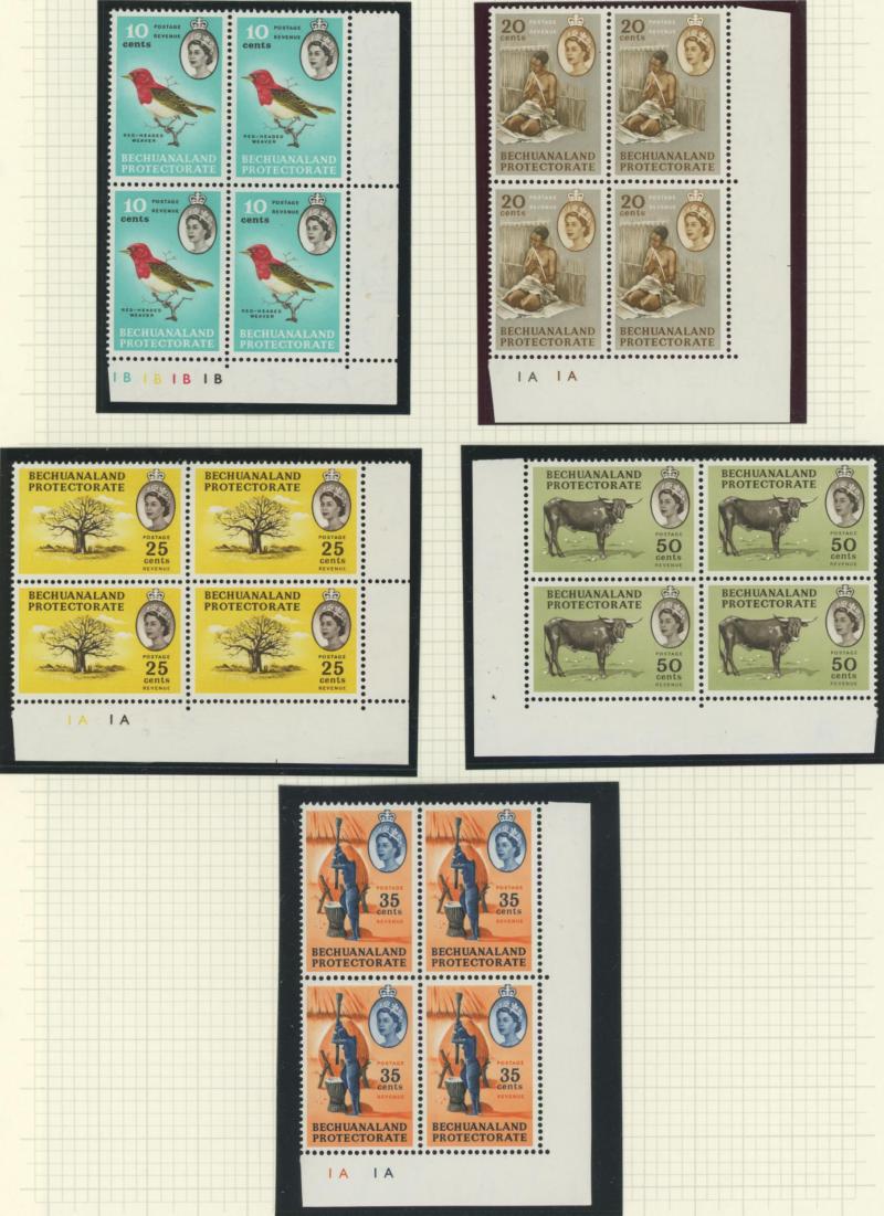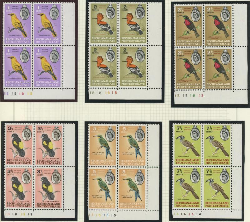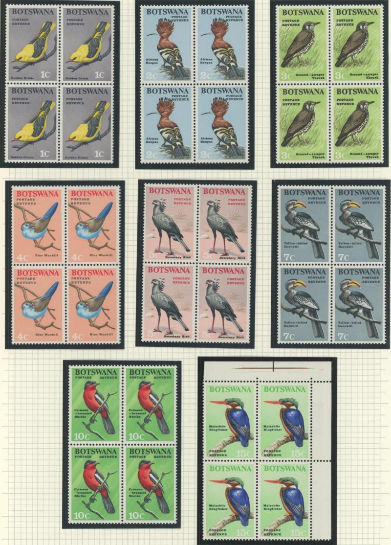 lower-right corners of the sheets, plus Botswana 1967 Birds 1c to 2r set SG 220-233 in blocks of 4, all unmounted, Cat £500+ for singles.