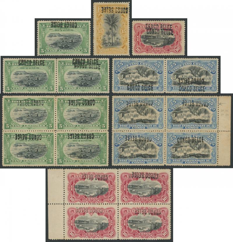 Train 'CONGO BELGE' Overprints *, '15c' on 50c Train 1909 'CONGO BELGE' Uni-Lingual issue single * & block of 4 **, '30c' on 10c Congo River inscribed 'DIX' at top ** (W Balasse guarantee handstamp), and '1921' on 5f Chief & Wife 'CONGO BELGE'