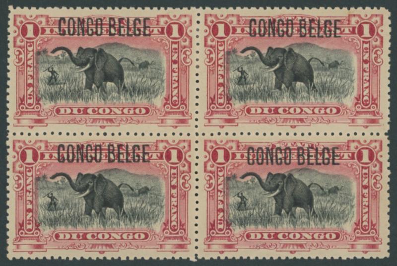1909 'CONGO BELGE' Overprints on Pictorials 1f Elephant Hunt black & carmine SG 52 (Scott 37) block of 4, well-centred, small hinge