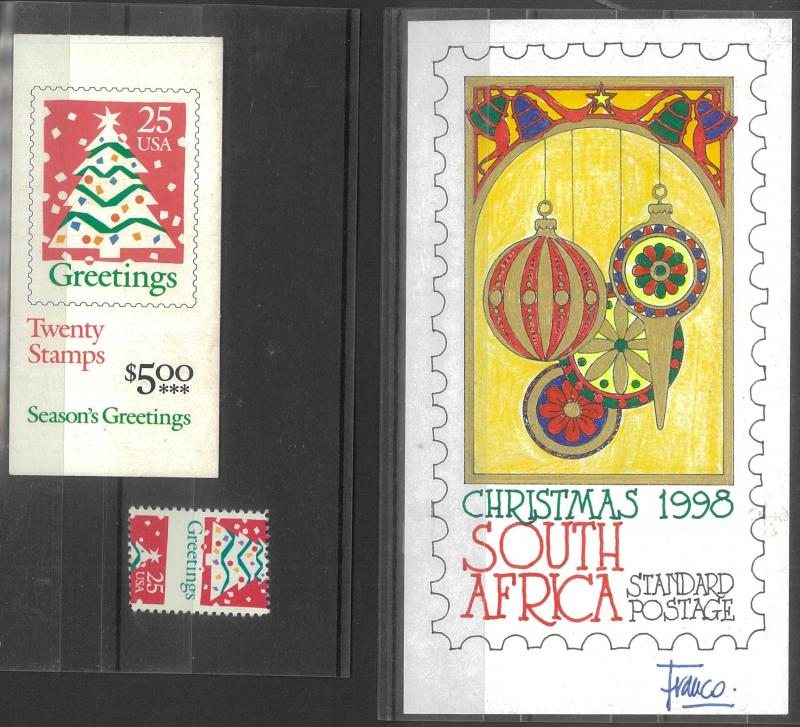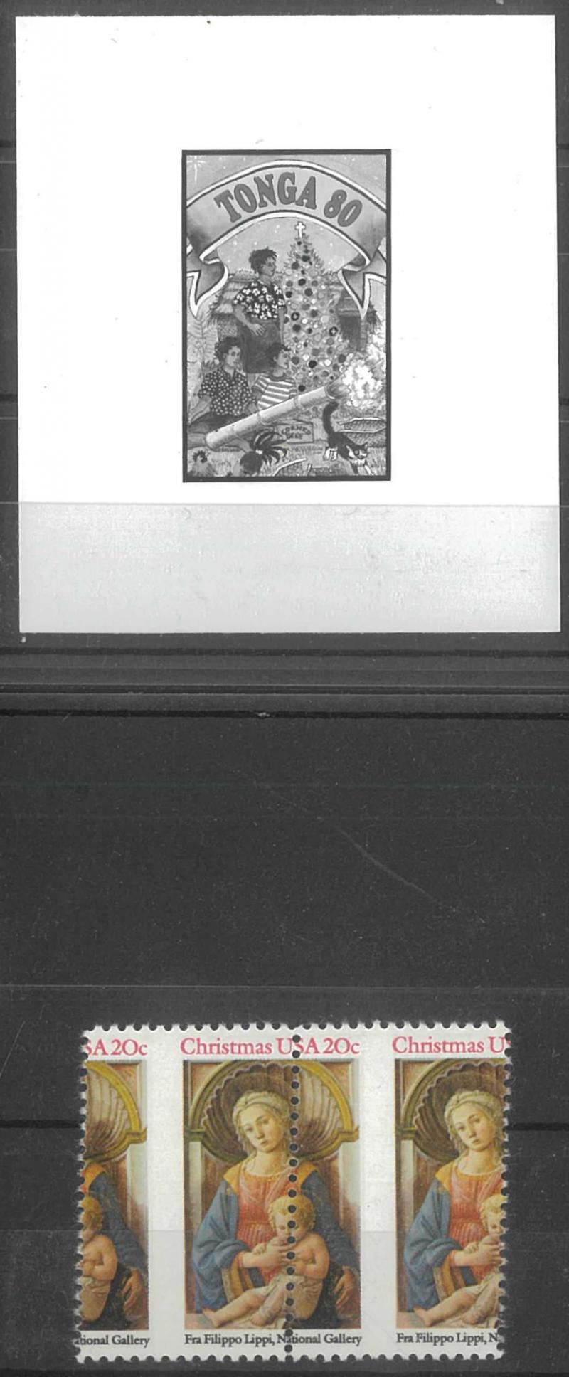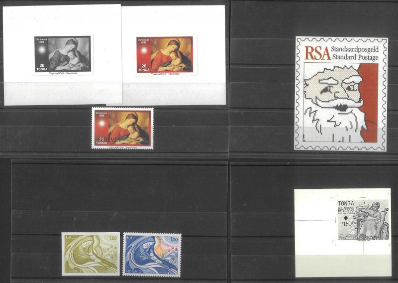 CHRISTMAS: Eclectic group with original artwork for two South African designs and for Tonga 1993 issue (beautiful), a few imperf