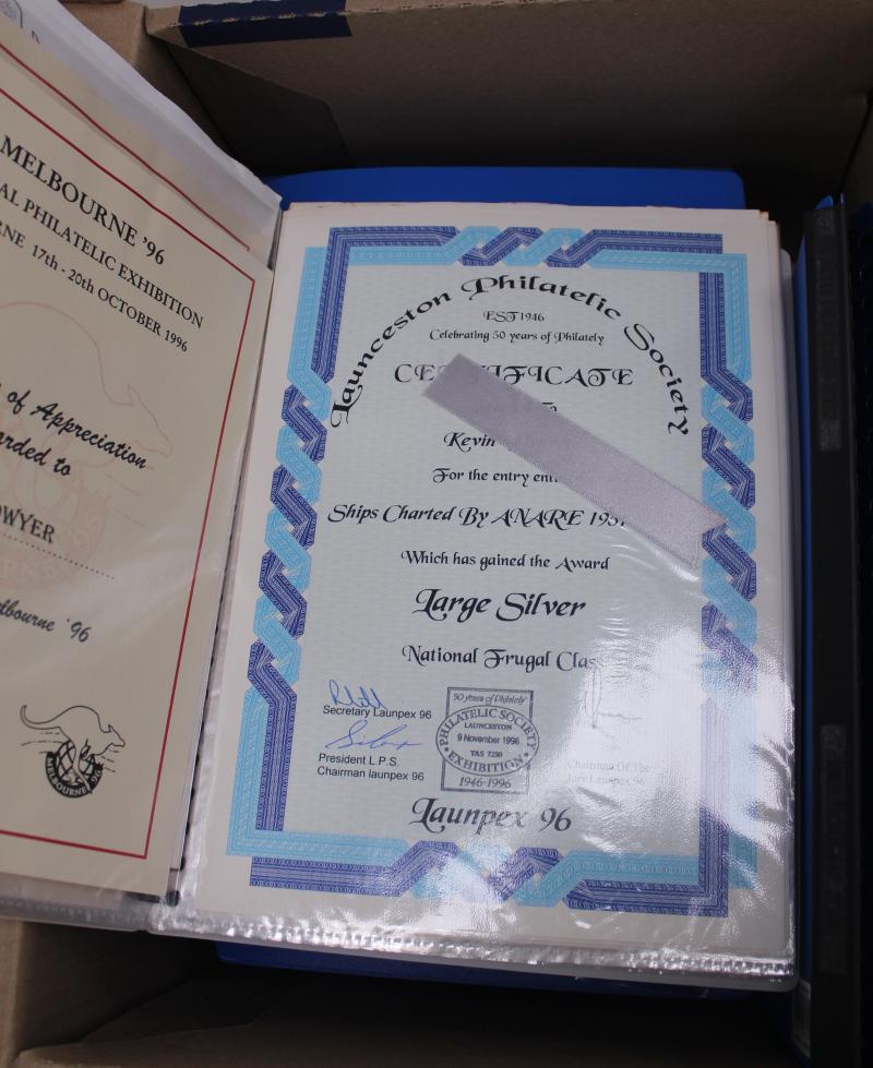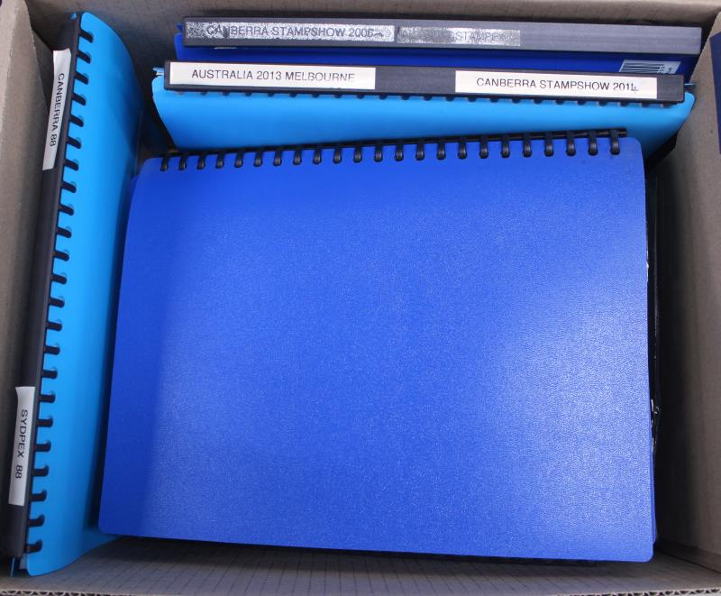 PHILATELIC EXHIBITIONS: Two cartons of exhibition catalogues, awards, medals, show postmarks and products, exhibitor passes, etc.