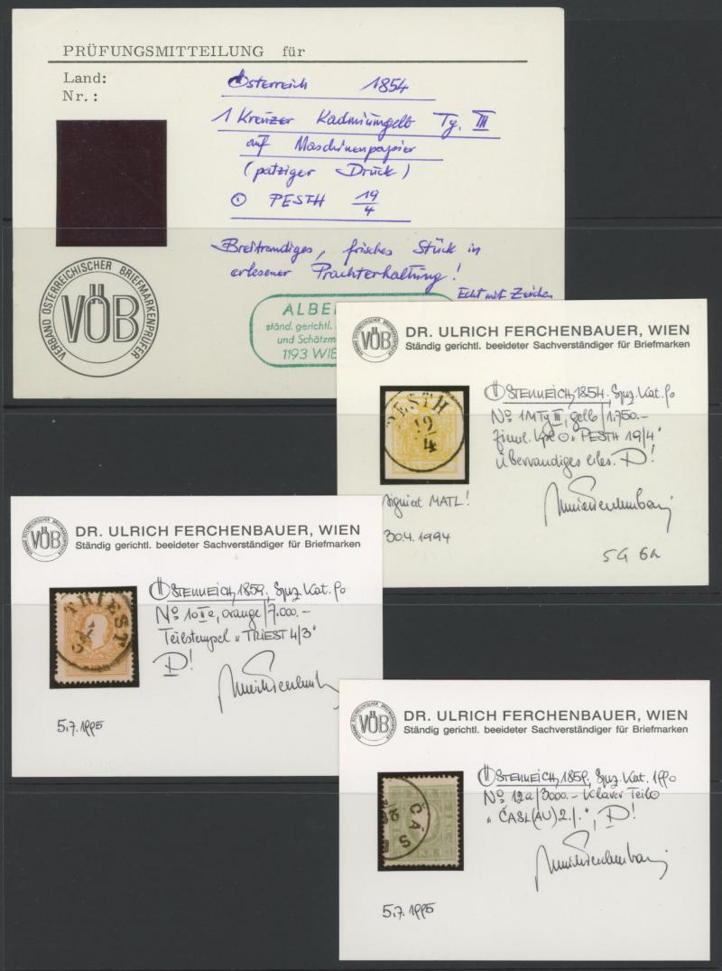 orange (Ulrich Ferchenbauer (1995) Certificate), 3kr light green (Ulrich Ferchenbauer (1995) Certificate) and a darker shade on small piece, also Newspaper Stamps Imperf 1858 (1k.05) blue margins good to just touching at left & 1861 (1k.05) grey
