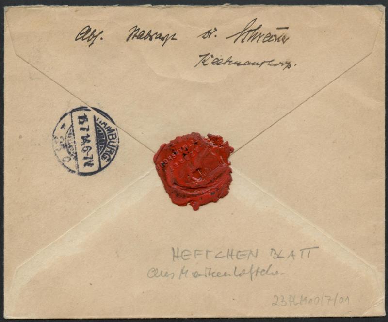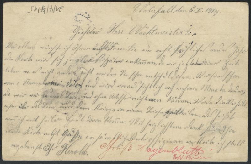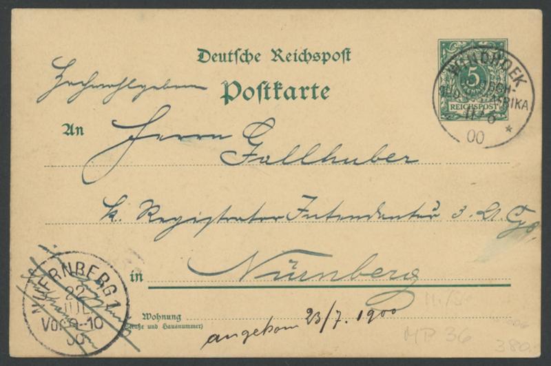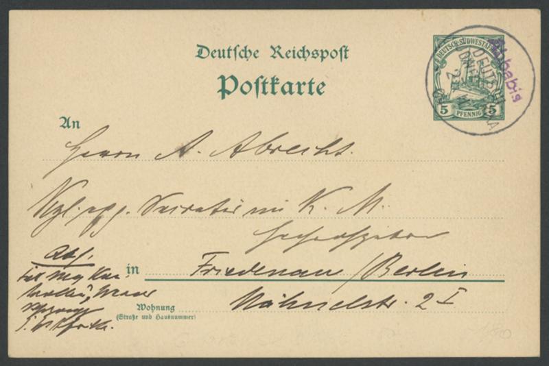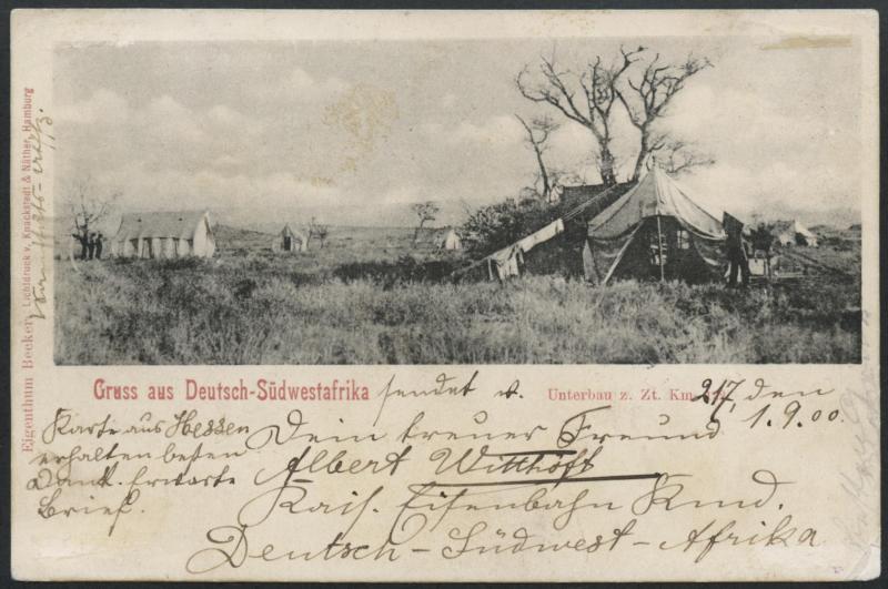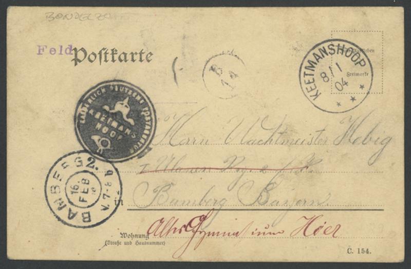 strike of 'KEETMANSHOOP/8 1/04/***' cds and 'KAISERLICHE DEUTSCHE POSTAGENTUR/KEETMANSHOOP' mailbag seal, 'BAMBERG 2/16/FEB/04' arrival cds, message in German headed "Waterfall 6.I.04". It took the German Forces three years to suppress the Herero