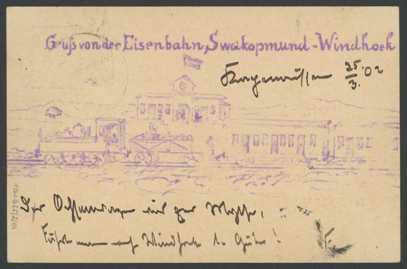 SOUTH WEST AFRICA: 1902 usage of 5pf Postal Card with roneographed railway illustration headed 'Gruss von der Eisenbahn