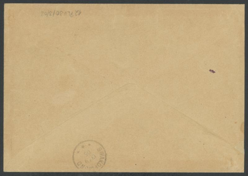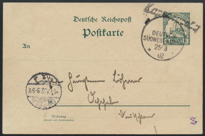 Swakopmend-Windhoek' in violet on the reverse, to Germany with superb Wanderstempel of 25.3/02 & very fine 42mm straight-line 'Kapenousseu' handstamp (the third of four similar markings), 'OPPELN' arrival cds. An unusual usage of a commemorative