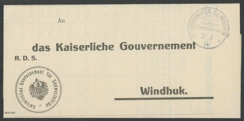 SOUTH WEST AFRICA: 1914 usage of Official Rainfall Report with light but fine strike of the very scarce 'BRACKWATER Bz