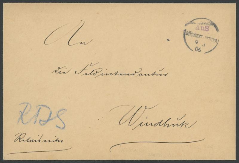 unengraved Wanderstempel of 7.9/05, on stampless official cover to "Swakopmund" (light large-part arrival backstamp of 13.9/05), minor bends. Ralph Putzel & Peter Morrison at page 155 state that the cds was an old one from which the inscriptions had