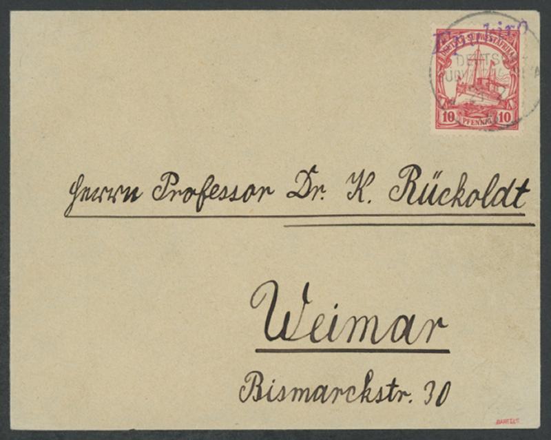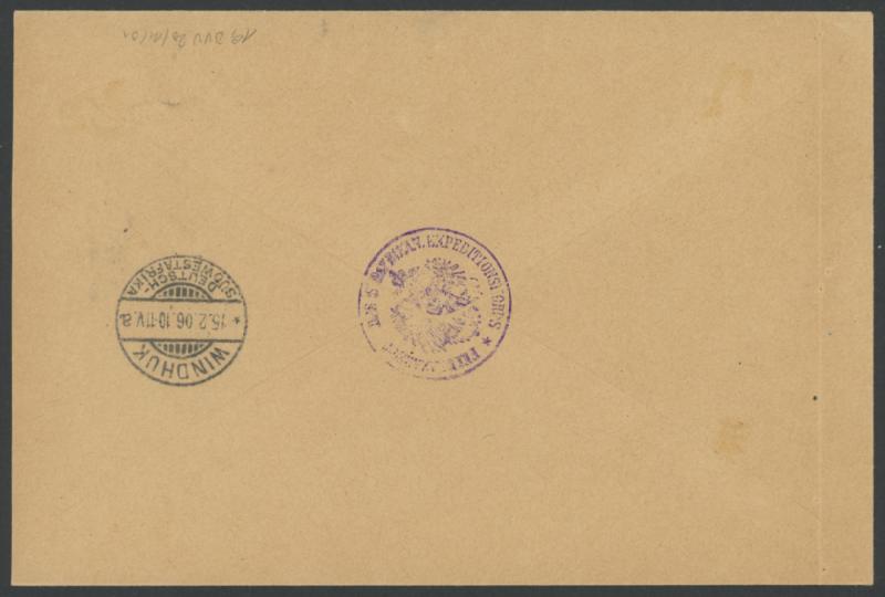 official cover to "Windhuk', largely fine 'FELDLAZARETT DES SUDAFRIKAN. EXPEDITIONSKORPS/[eagle]' (= Field Hospital...) cachet in violet across the flap & very fine 'WINDHUK/15.2.06...' arrival backstamp, vertical fold & associated pinholes at far