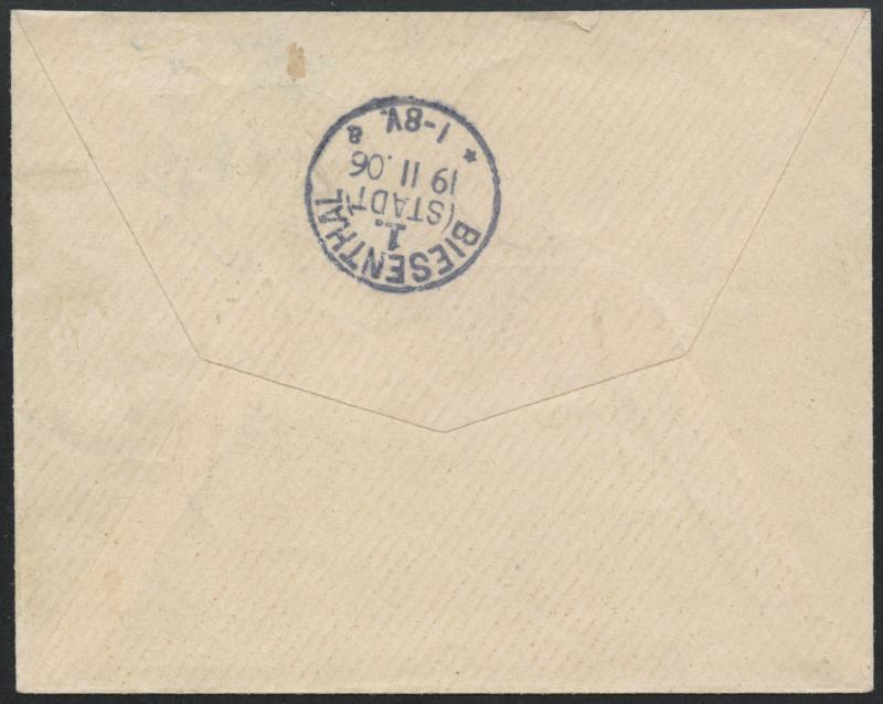 Wanderstempel Type V of 17.10/06, on 5pf x2 & 25pf on philatelic cover to Germany with another strike on provisional R label, superb 'BIESENTHAL/19.11.06' arrival backstamp. Superb. (Image1) (Image2)