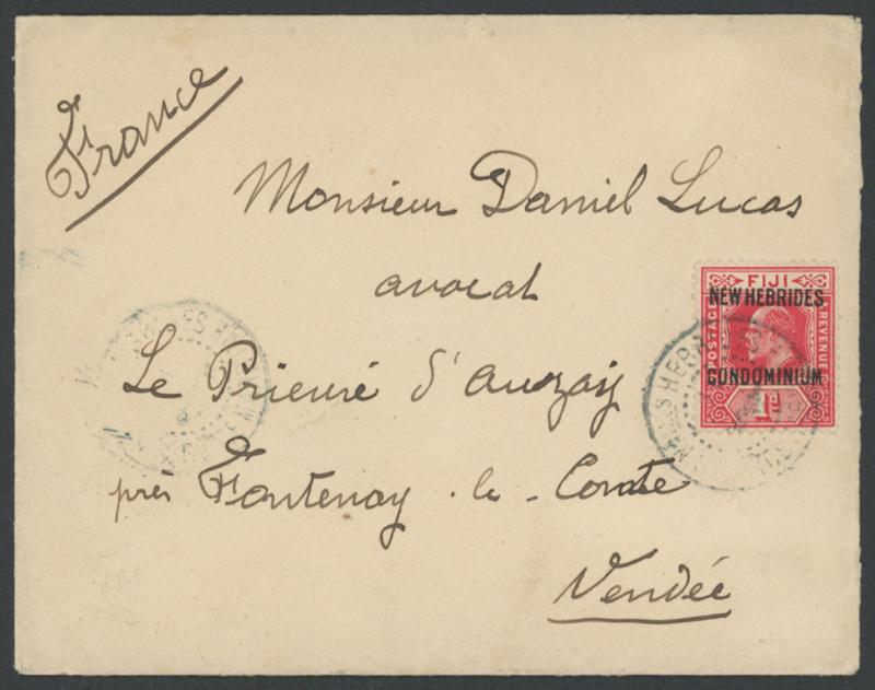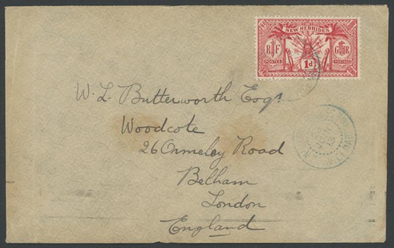 British 'VILA/JU10/20/NEW HEBRIDES' cds, light bends & minor blemishes. Ex 'Aore'. Probably 90% of all covers with the 1920 Surcharges are obviously philatelic. (Image1) (Image2)