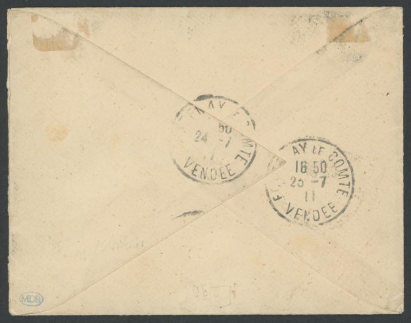 HEBRIDES/SERVICE MARITIME' (date unclear), underpaid but not taxed, 'FONTENAY LE COMTE/23-7/11/VENDEE' arrival backstamp. Not recorded by Roland Klinger. (Image1) (Image2)