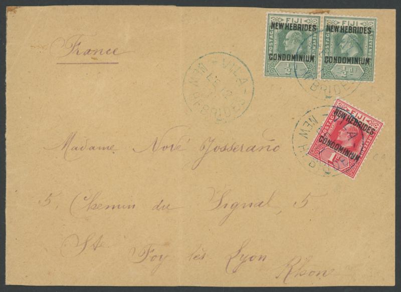 1911 over-franked 'CONDOMINIUM/des/NOUVELLES-HEBRIDES' to Scotland with 1910 Second Overprints on Fiji 2d x6 2½d 5d 6d & 1/- tied