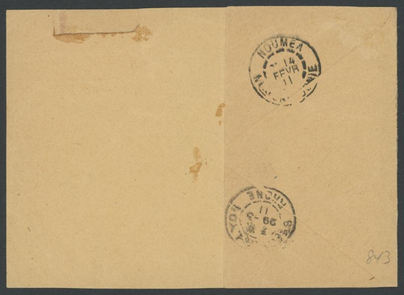 strikes 'VILA/FE12/11/NEW HEBRIDES' cds in blue, the reverse with 'NOUMEA/ 14/FEVR/11/...' (Valentine's Day) transit & Lyon arrival cds of 29-3/11, light vertical fold & minor repair at the top. Not recorded by Roland Klinger. (Image1) (Image2)
