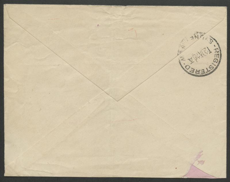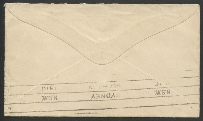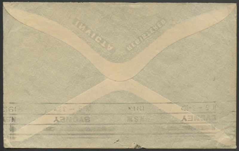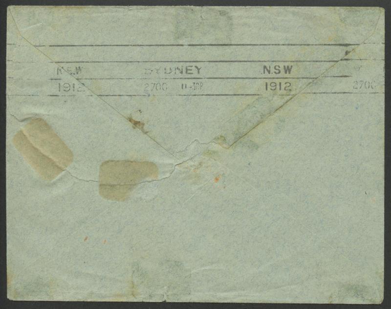 'NOUMEA/21/OCT/12/NLLE CALEDONIE' cds, Sydney machine arrival backstamp of 27OC-1912, roughly opened at the back & amateurishly repaired. The rate was either 10c x3 or 10c x2 + 10c shipletter fee. Not recorded by Roland Klinger. (Image1) (Image2)