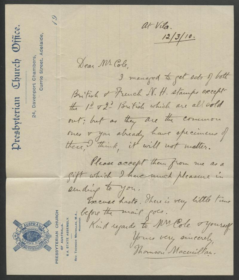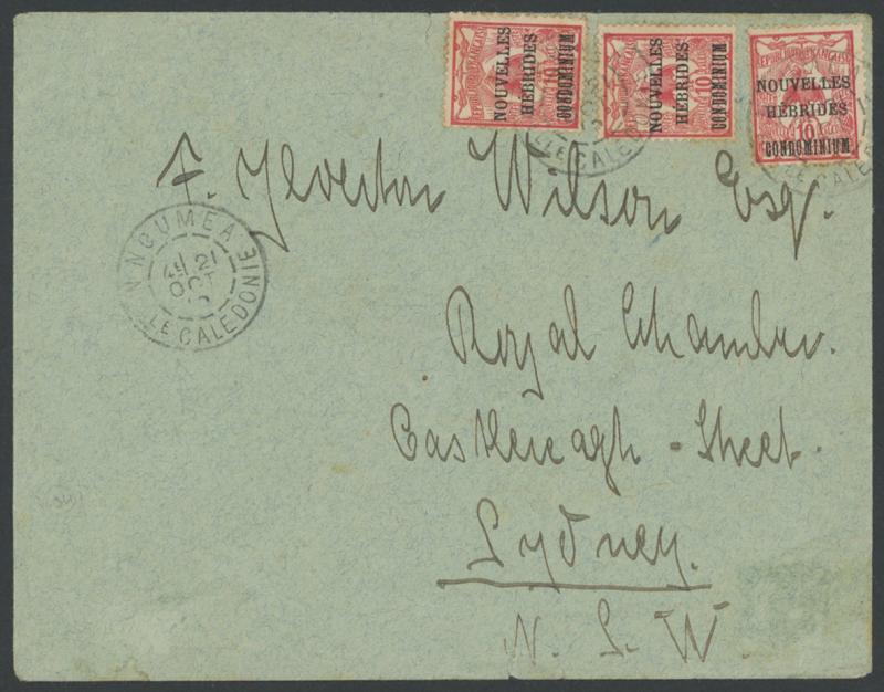 of 'PORT-VILA/13/MARS/10/NELLES HEBRIDES' cds, the reverse with Sydney machine arrival of MR24-1910. Ex 'Aore'. The enclosed letter headed "At Vila/12.3.10" & signed "Thomson Macmillan" states he is enclosing both current sets of stamps. Rev Thomson