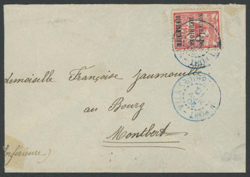 to fine strikes of 'PORT-VILA/20/NOV/10/NELLES HEBRIDES' cds in blue, 'MONTBERT/1-1/11/LOIRE-INFRE' arrival backstamp (New Year's Day), hinge remainder at lower-left. Not recorded by Roland Klinger, who records nine earlier Second Issue covers, of