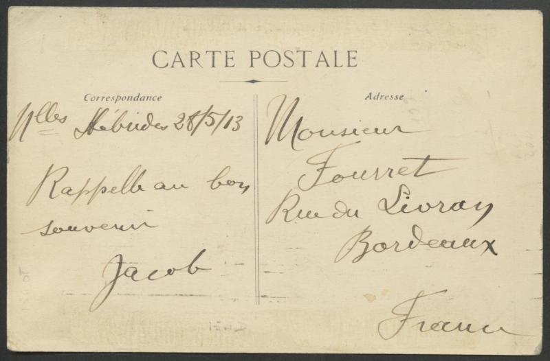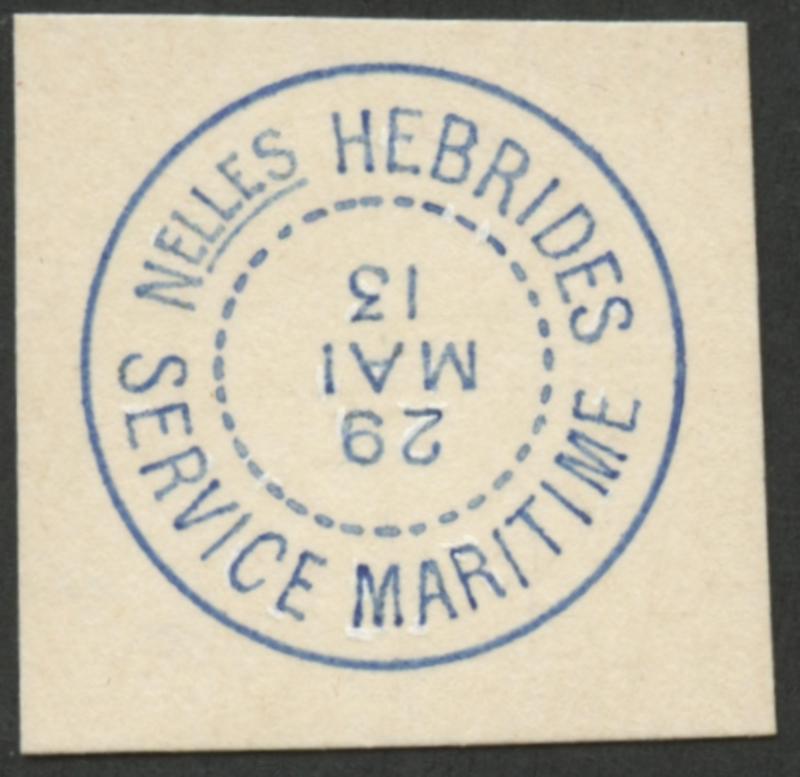 partial but obvious 'NELLES HEBRIDES/29/MAI/13/SERVICE MARITIME' cds (all date slugs inverted) in blue, Sydney machine transit backstamp of 6JE-1913, bumped corners. Ex 'Aore'. (Image1) (Image2)