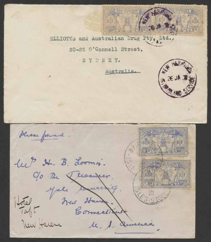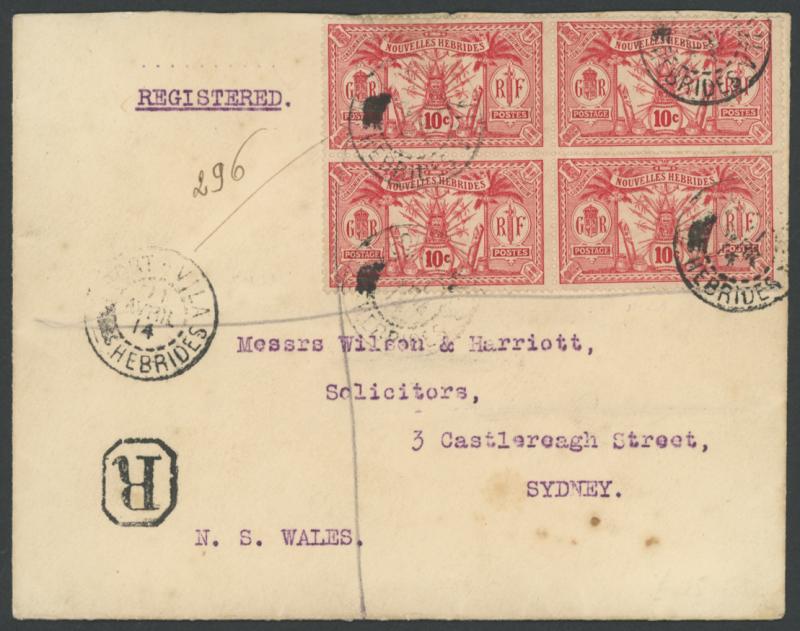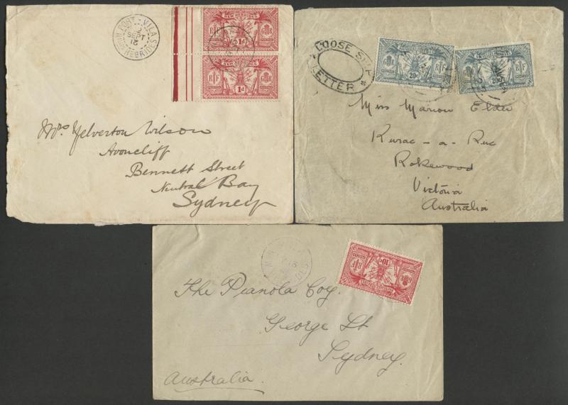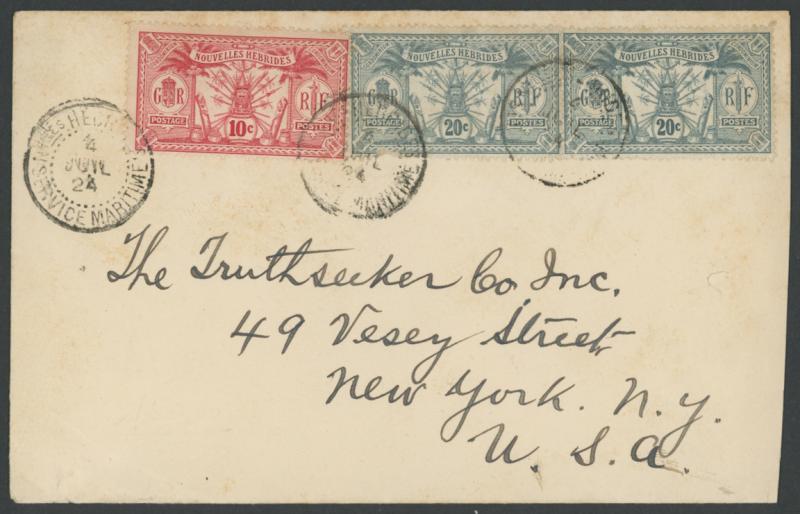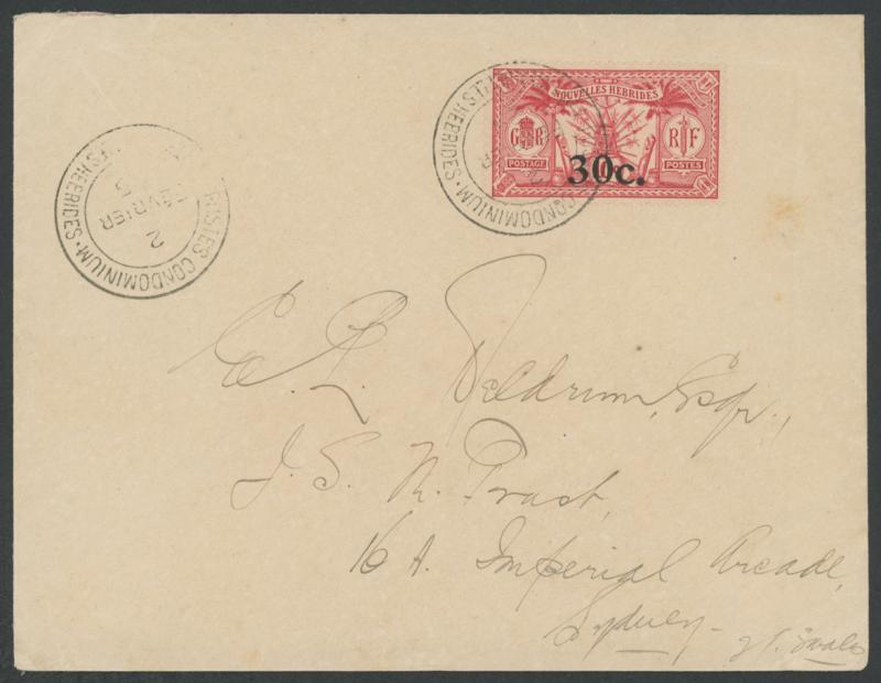 double-ring 'POSTES CONDOMINIUM/29/DECEMBRE/24/PORT VILA NELLES HEBRIDES' cds, 'Port-Vila/Nouvelles Hebrides' R cachet, Sydney transit backstamp of 12JA25, minor bends & ironed-out vertical fold. (Image1) (Image2)