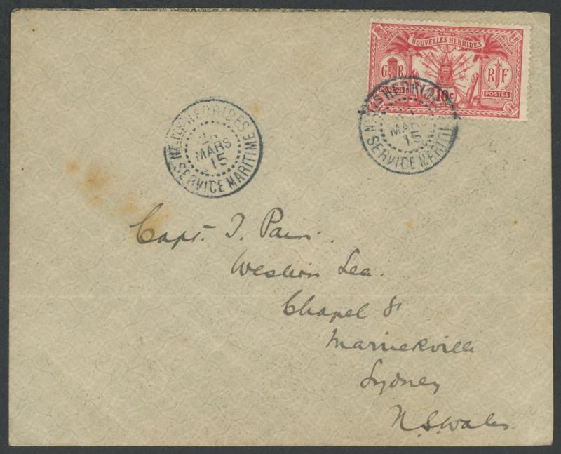 HEBRIDES/26/MARS/15/SERVICE MARITIME' cds, Sydney arrival backstamp of 3AP15, light horizontal fold towards the base & some light toning. Not recorded by Roland Klinger. (Image1) (Image2)