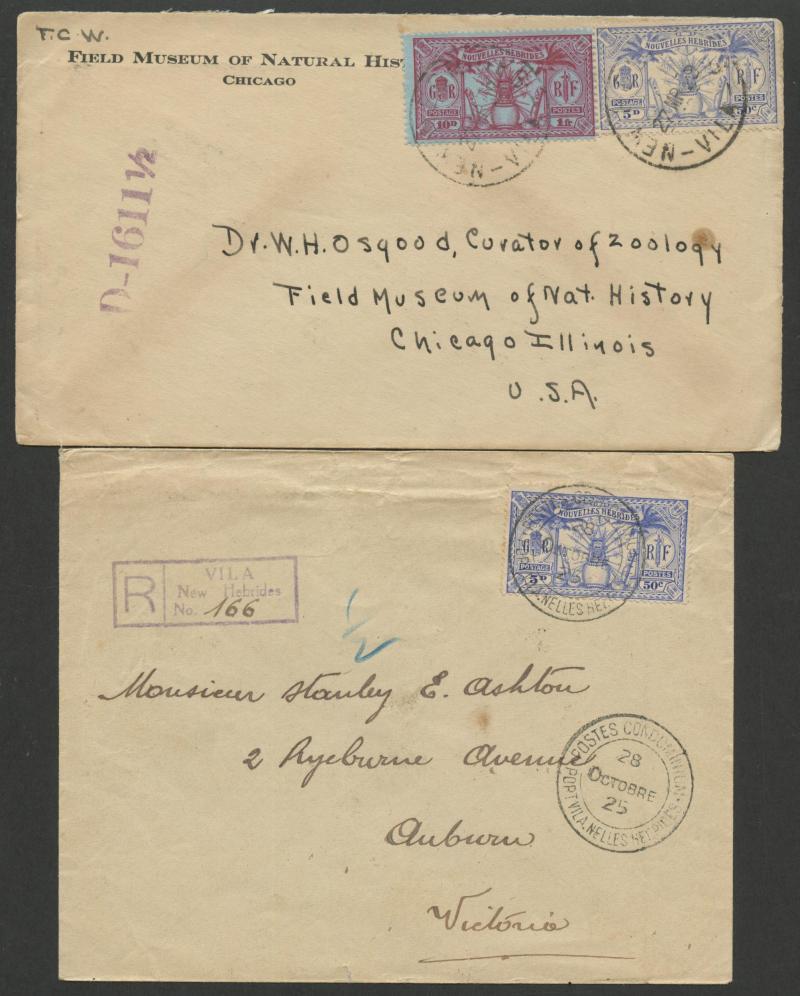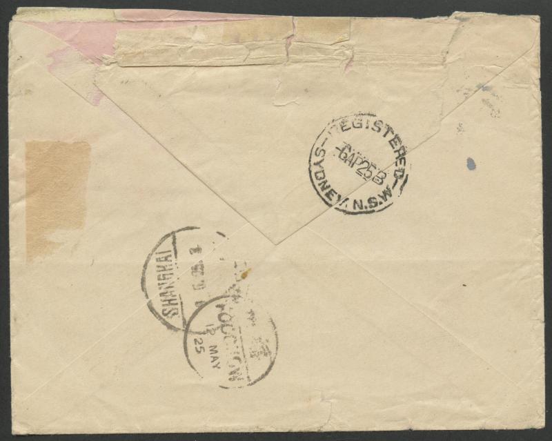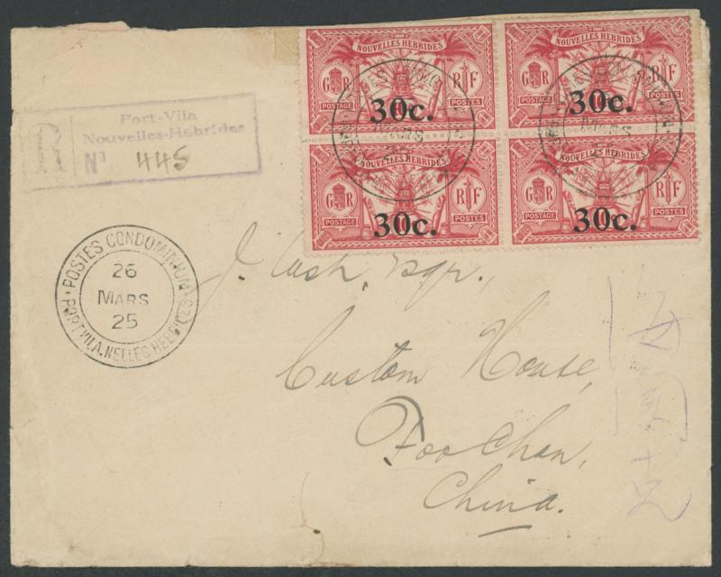 strikes of double-ring 'POSTES CONDOMINIUM/26/MARS/25/PORT VILA NELLES HEBRIDES' cds, 'Port-Vila/Nouvelles Hebrides' R cachet in violet, the reverse with Sydney transit of 6AP25 plus Chinese-pattern 'SHANGHAI/9.5.25/...' transit &