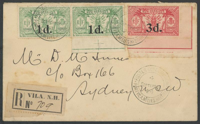 1924 (Sep 4) cover to NSW with Overprints '1d.' on ½d x2 & '3d.' on 1d, French double-ring cds but British black/white 'VILA. N.H.'