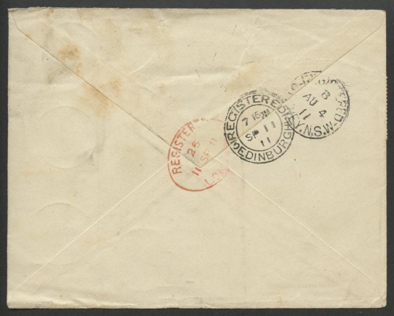 by French cds of 1/JUIL/11, 'R'-in-octagon cachet at lower-left, the reverse with transits of Sydney (AU4) & London (11SP11) & very fine Edinburgh arrival of the same day, minor toning. Philatelic but very attractive. Ex 'Aore'. (Image1) (Image2)