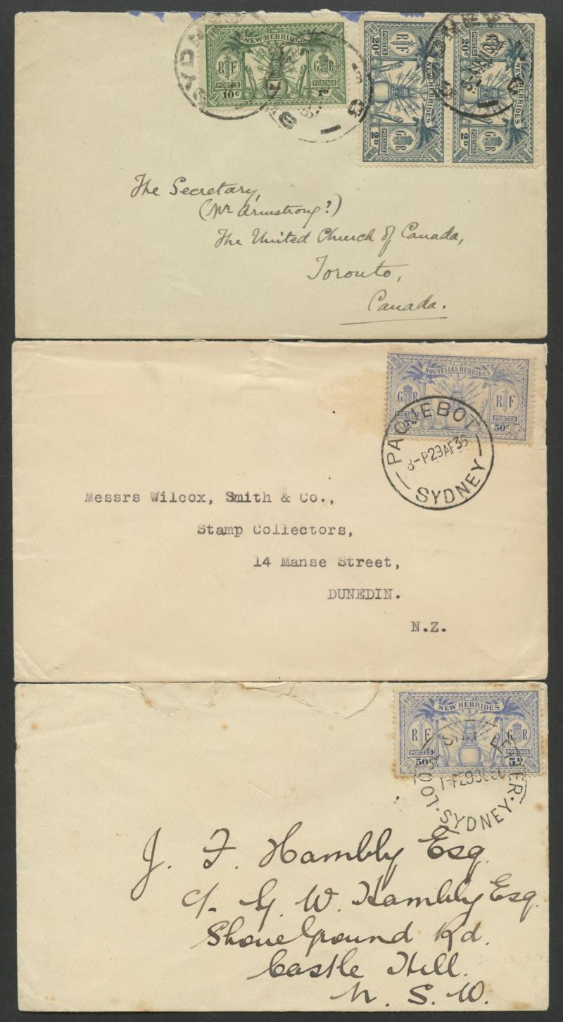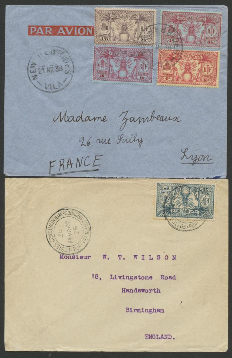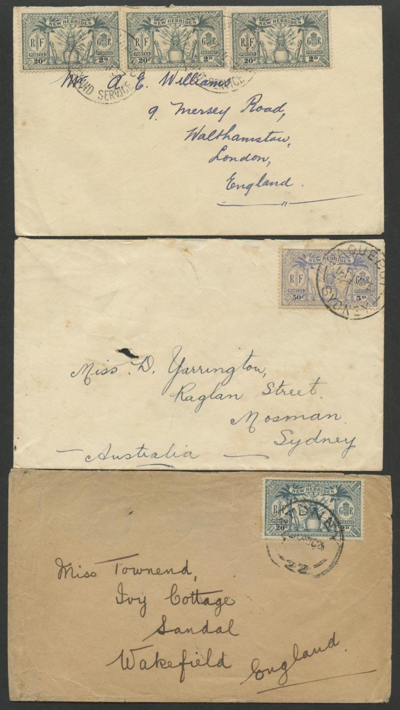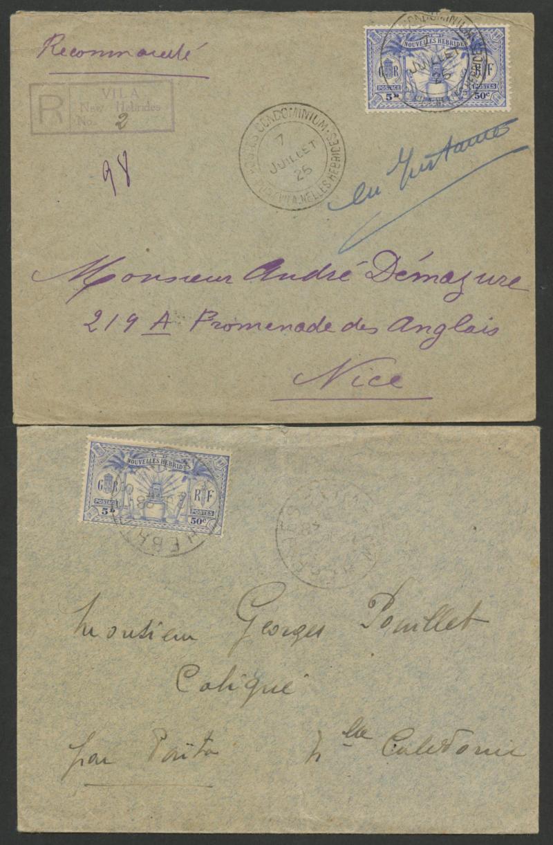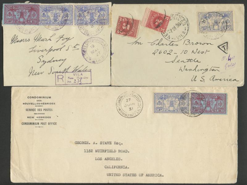 British R cachet, local 'Le Neo-Hebridais' (journal) cover with 1d only, 1931 '.../CONDOMINIUM POST OFFICE' cover to USA with 50c & 1fr, 1933 Orient Line cover with British 2d + French 10c & 30c, 1933 Raymond & Whitcomb cover with British 5d & French
