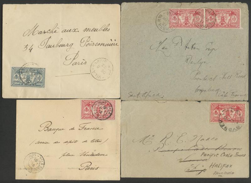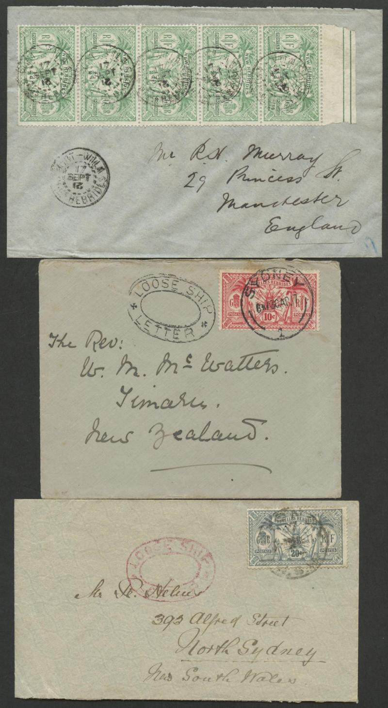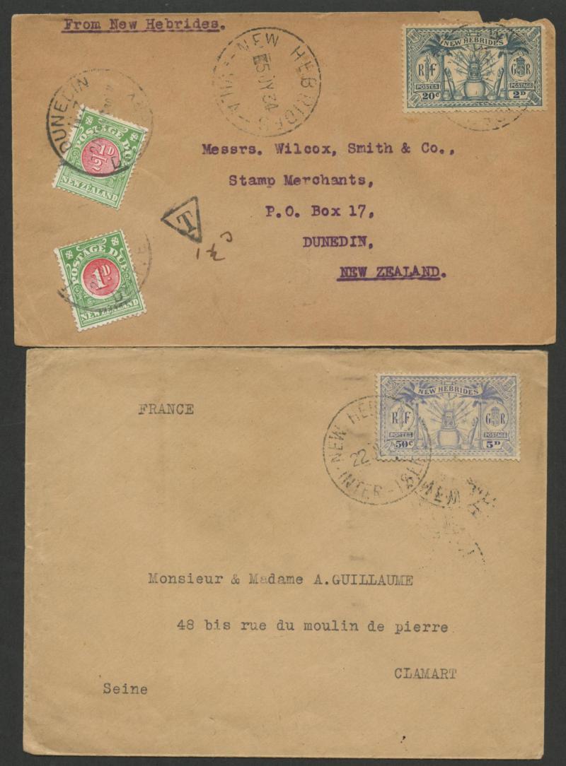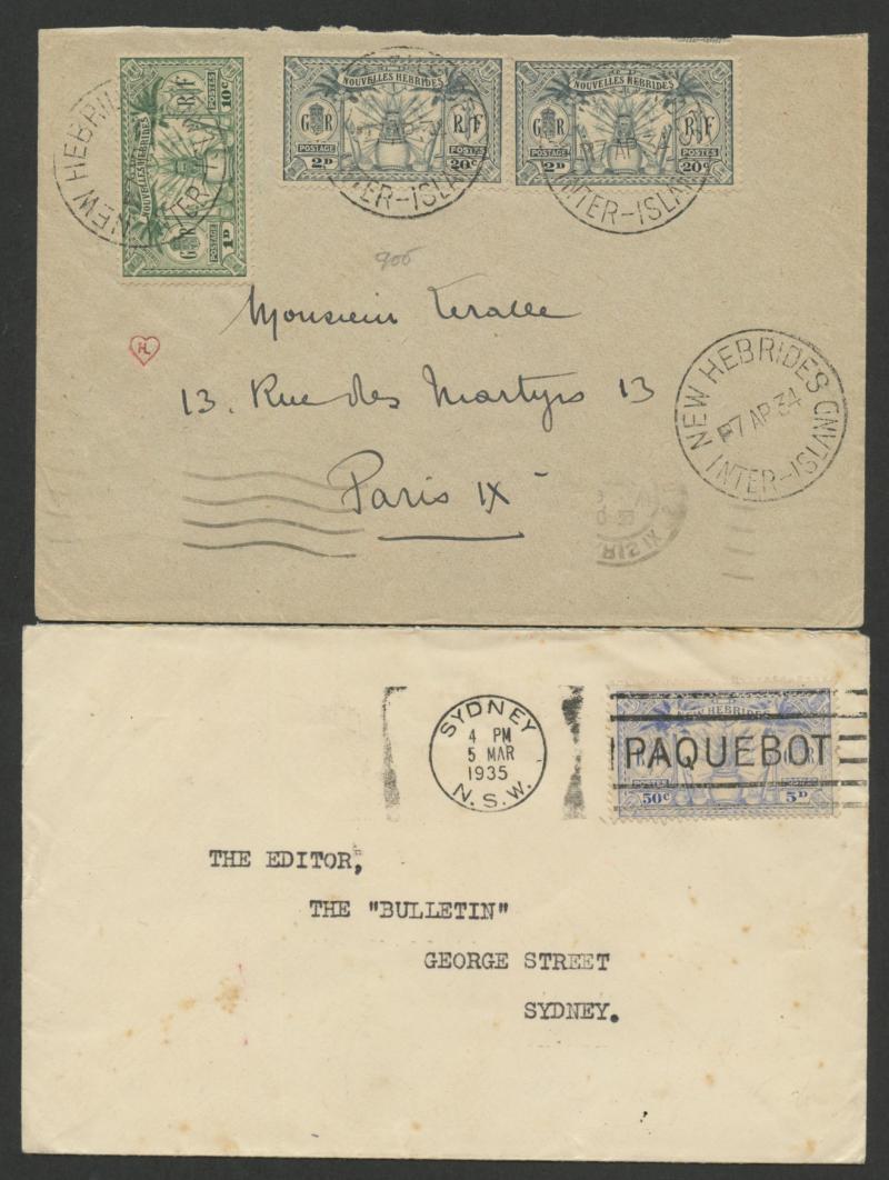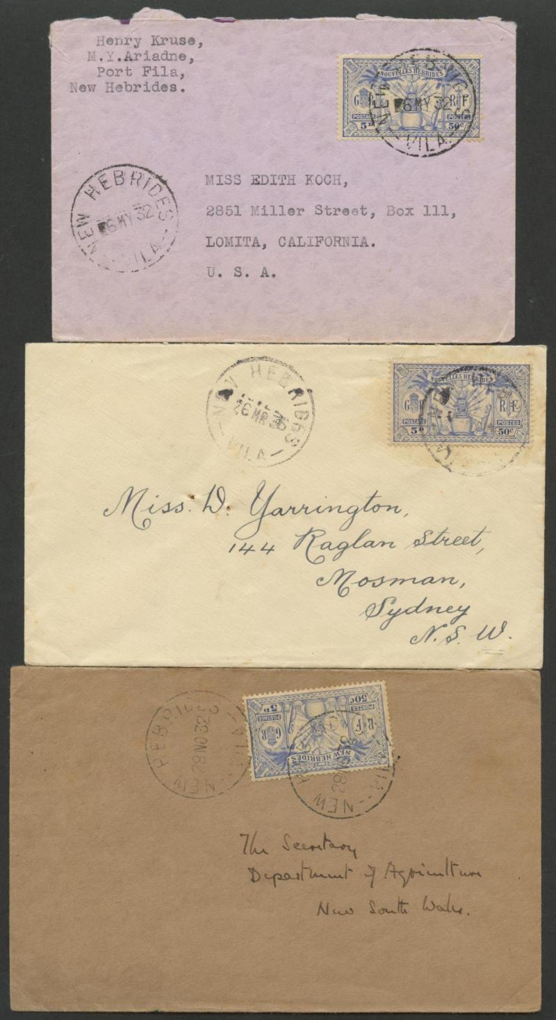 British R cachet, local 'Le Neo-Hebridais' (journal) cover with 1d only, 1931 '.../CONDOMINIUM POST OFFICE' cover to USA with 50c & 1fr, 1933 Orient Line cover with British 2d + French 10c & 30c, 1933 Raymond & Whitcomb cover with British 5d & French
