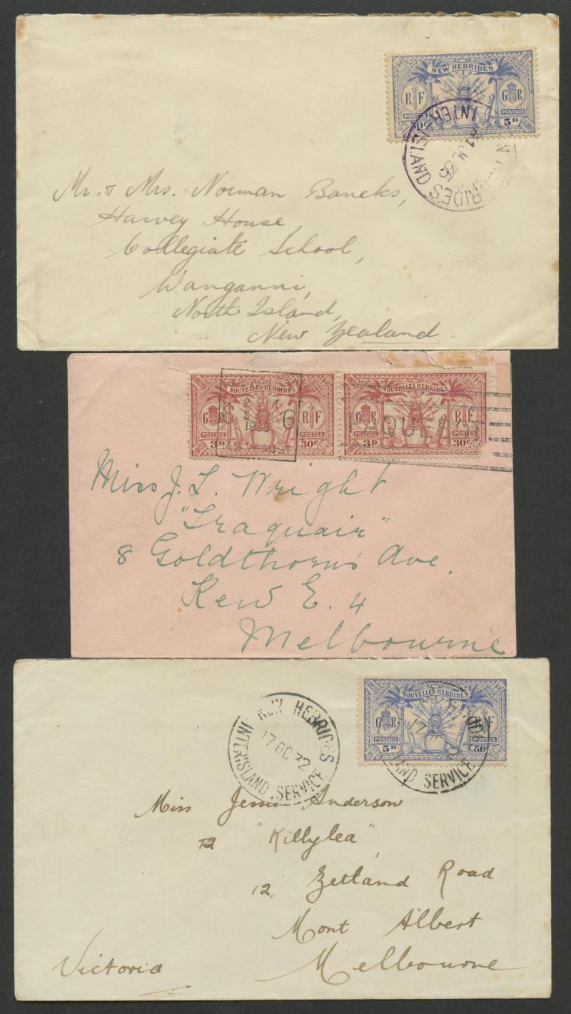 violet), 'INTERISLAND SERVICE' x3 (one in violet) or '.../INTER-ISLES' cds, five cancelled on arrival at Sydney (one with superb 'PAQUEBOT' machine cancel), underpaid & taxed to NZ (philatelic) or USA, registered to Victoria with French cds but