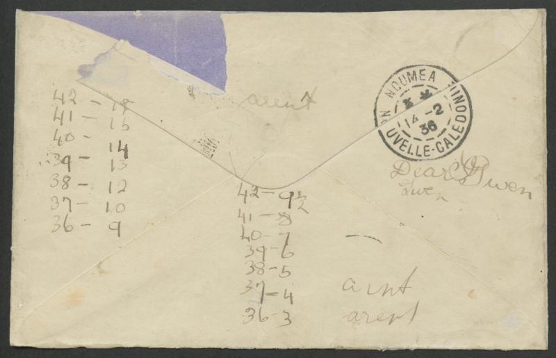 by two good to largely fine strikes of the undated two-line 'NOUMEA/NOUVELLE CALEDONIE' handstamp used as a Paquebot marking on loose ship letters, very fine 'NOUMEA/14-2/36/...' cds (Valentine's Day), ink scribblings on the reverse & small part of