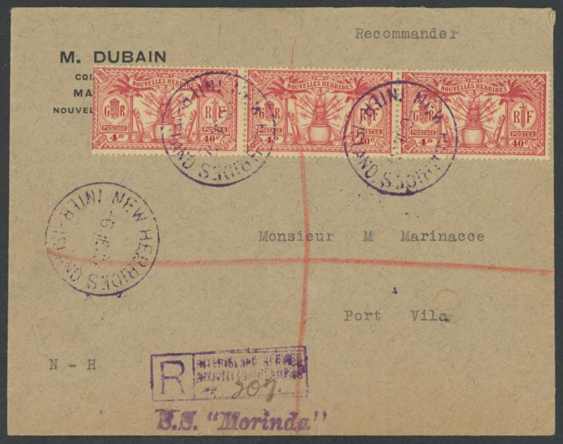 Currency French 40c (4d) SG F47 strip of 3 tied by two of three largely fine strikes of 'NEW HEBRIDES/6JE37/INTER-ISLAND' cds in violet as are the boxed 'INTER-ISLAND SERVICE/NOUVELLES HEBRIDES' R cachet & 'S.S. Morinda' handstamp at the base, very