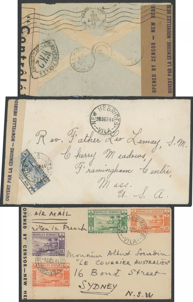 1941-44 social covers censored at Vila with bilingual 'OPENED BY CENSOR - NEW HEBRIDES/OUVERT PAR LA CENSURE...' labels comprising