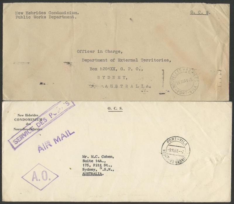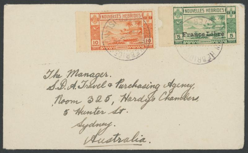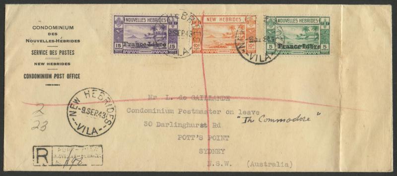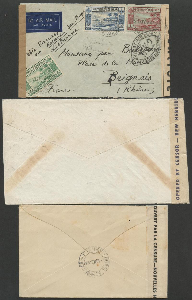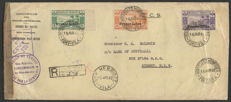 OFFICIAL MAIL: Selection including 1942 to NSW with 'France Libre' 5c 10c & 15c and 'PORT-VILLA/...' (error) R cachet, 1945 to NSW
