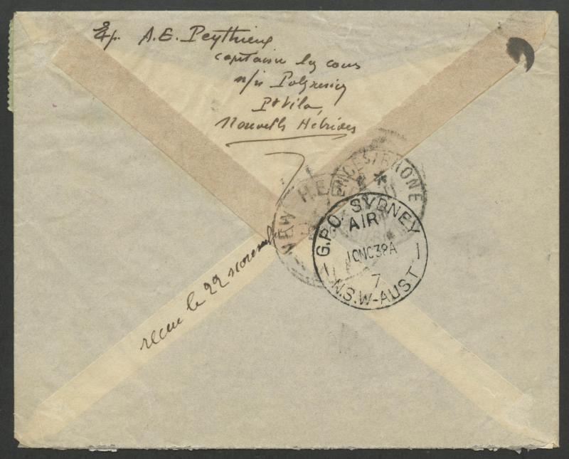 ship-board cachet on the face, to France with combination franking of 1938 Gold Currency French 50c + British 1fr tied by 'NEW HEBRIDES/29OC38/PORT VILA' cds, boxed Vila R cachet, Sydney transit of 10NO38 & 'VALENCE S RHONE/22-11/38/...' arrival