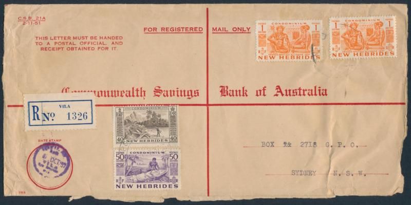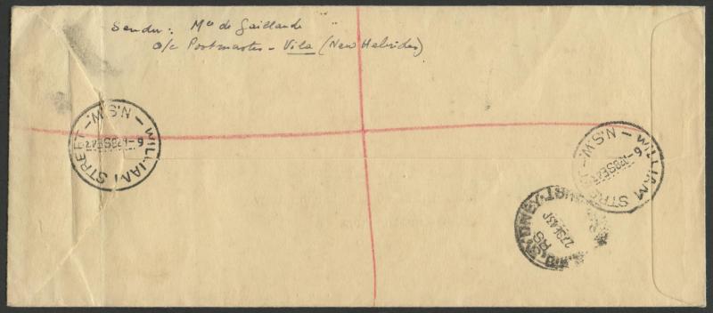 damage) across the flap, to Berkshire with combination franking 1925 Dual Currency British 5d (50c) & French 1fr (10d), black/white 'CONDOMINIUM DES N-H/VILA N-H' R label, Sydney transit backstamp of 23JY37, minor blemishes. (Image1) (Image2)