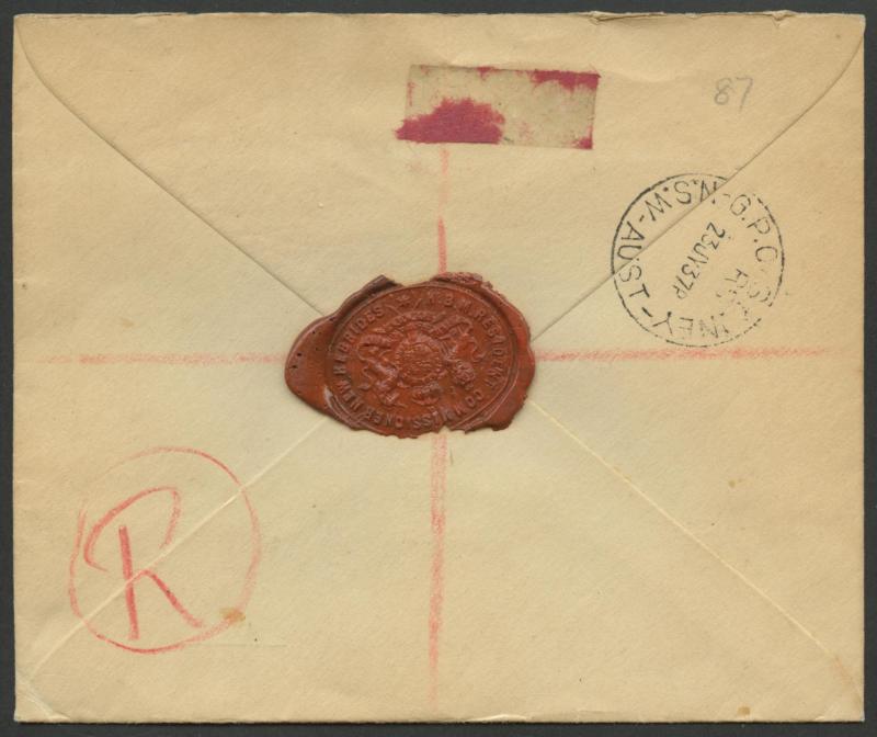 1937 (July 1) OHMS cover with superb impression of 'HBM RESIDENT COMMISSIONER NEW HEBRIDES/ [coat of arms]' in red wax (minor edge