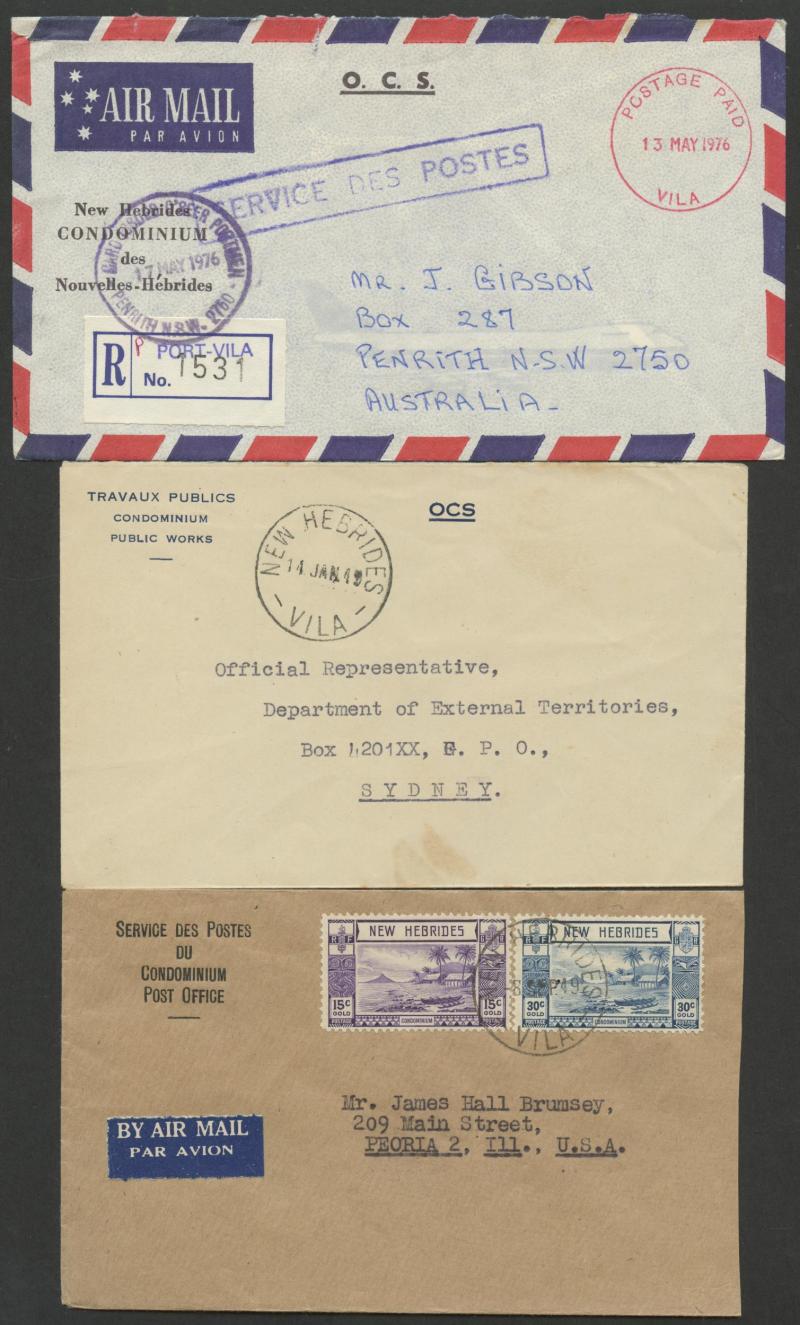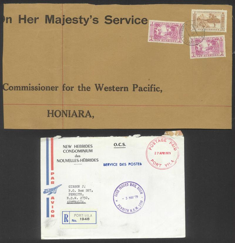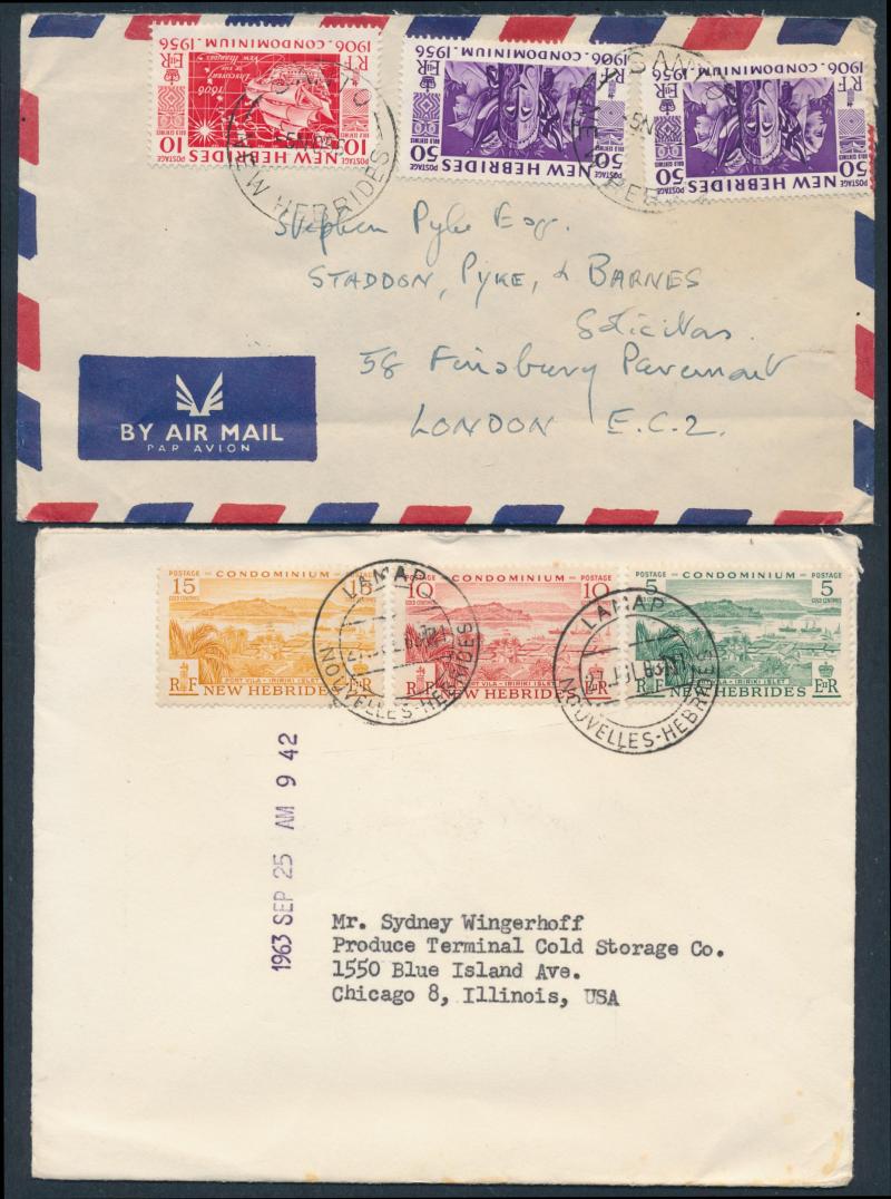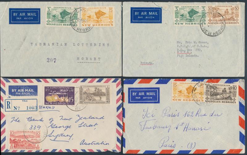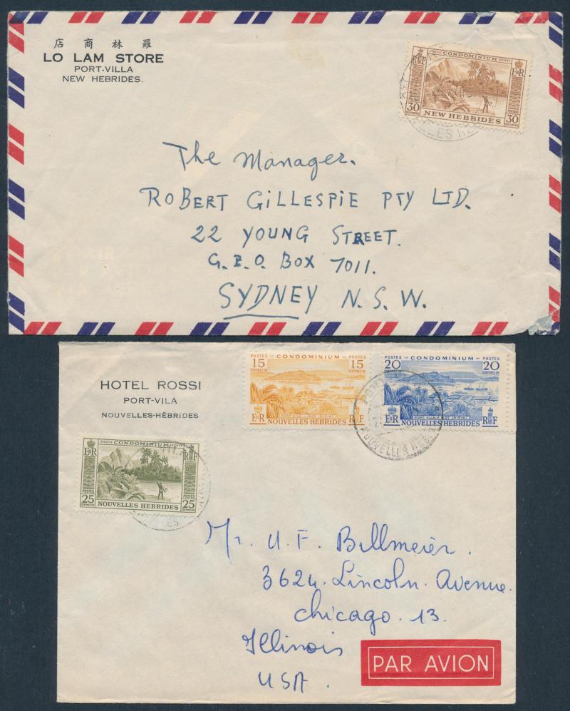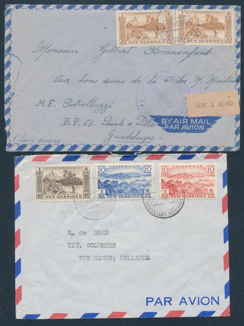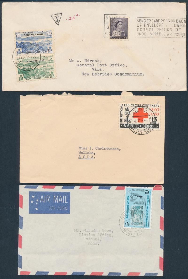MAIL. FEE/DEFICIENT/Vila No 1 (NH)' cachet (not recorded by Ted Proud) and to USA underpaid & taxed, Aerogrammes x7 unused/CTO, a few inwards items, generally fine to very fine. A very good lot.