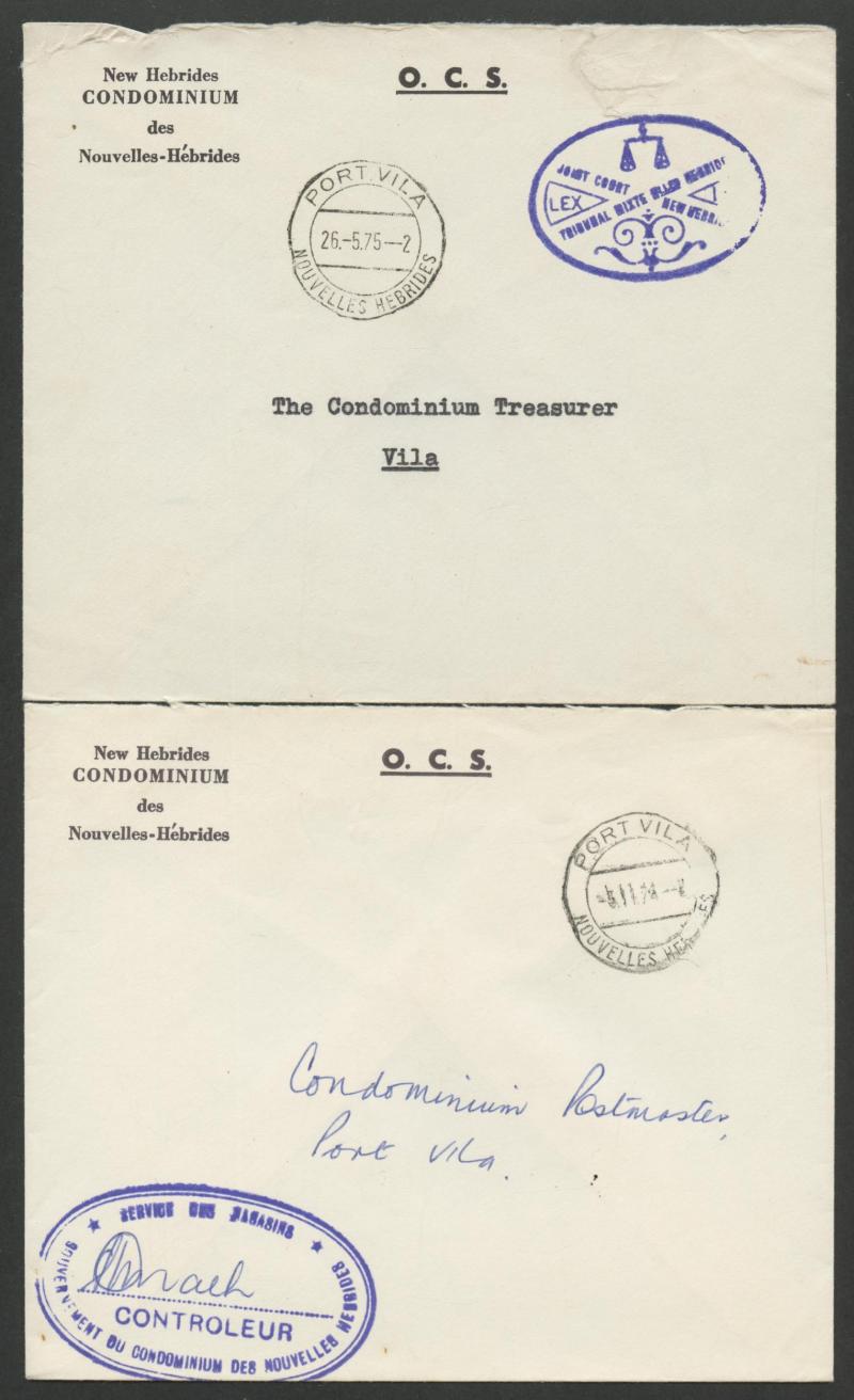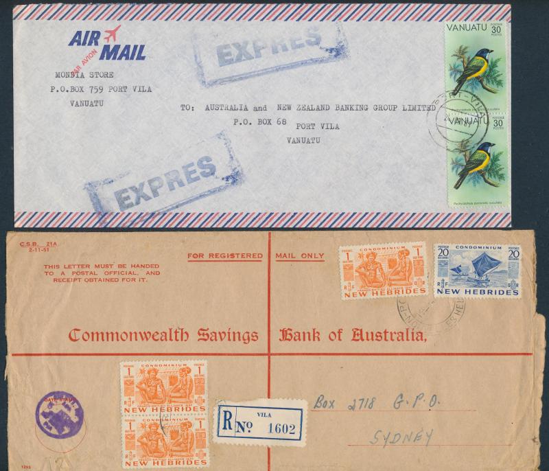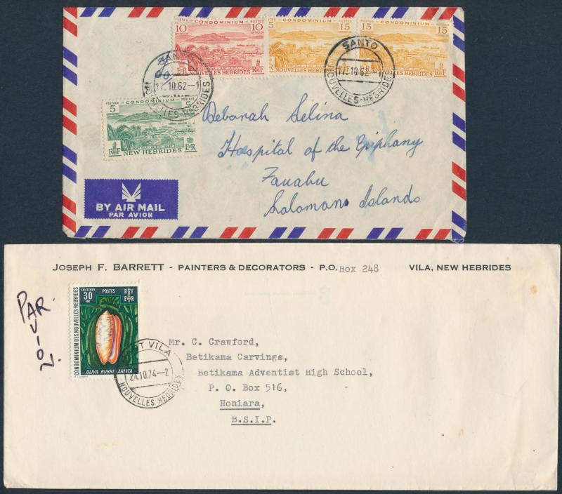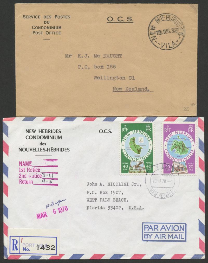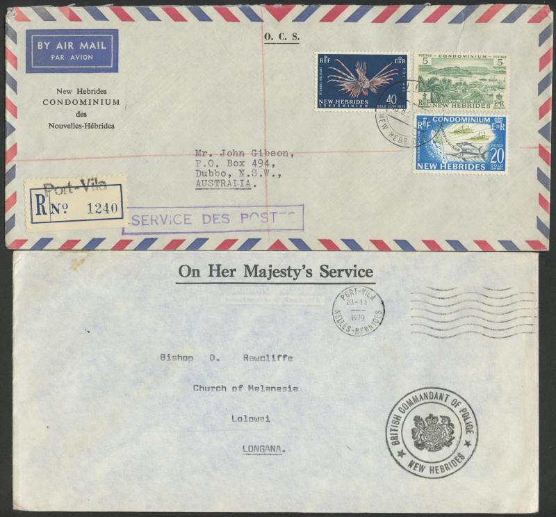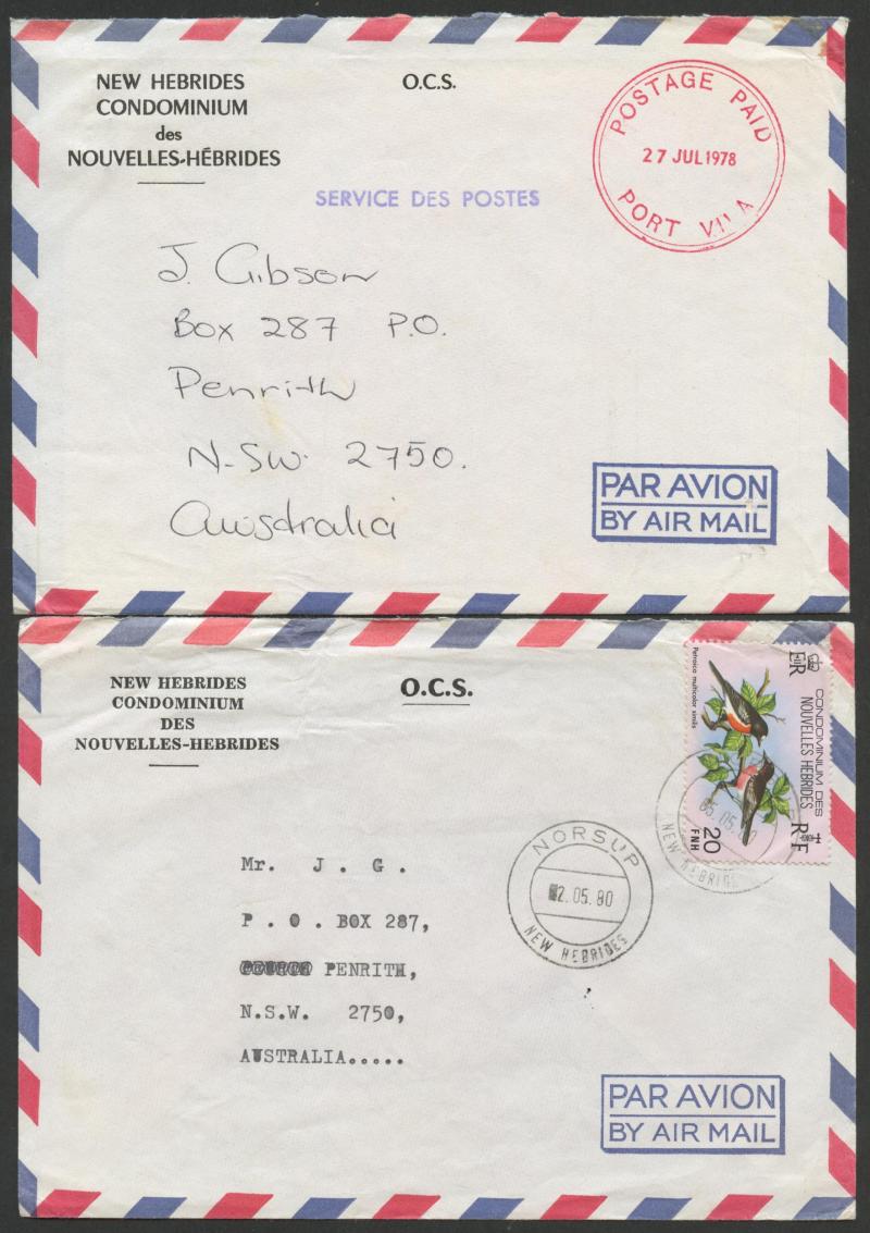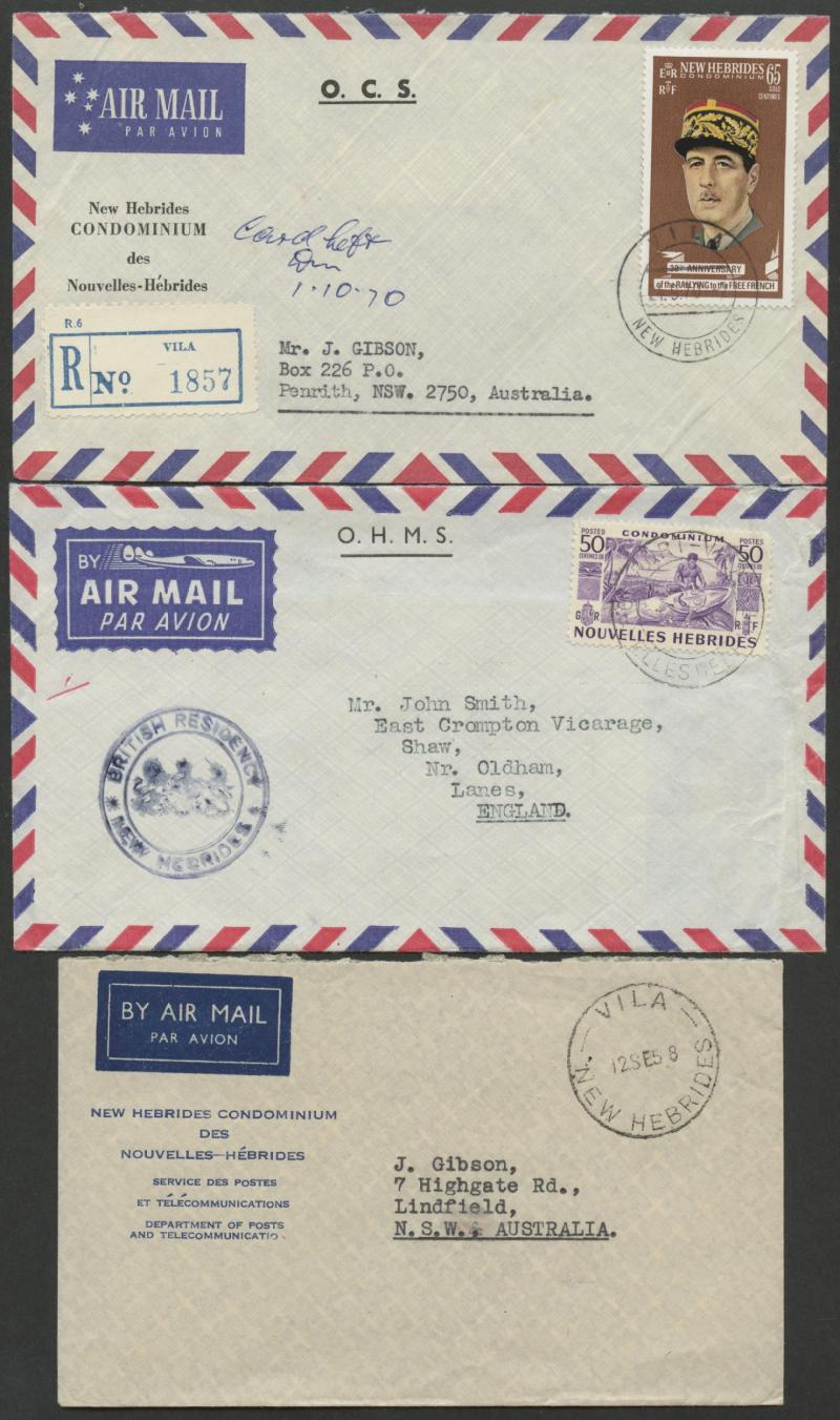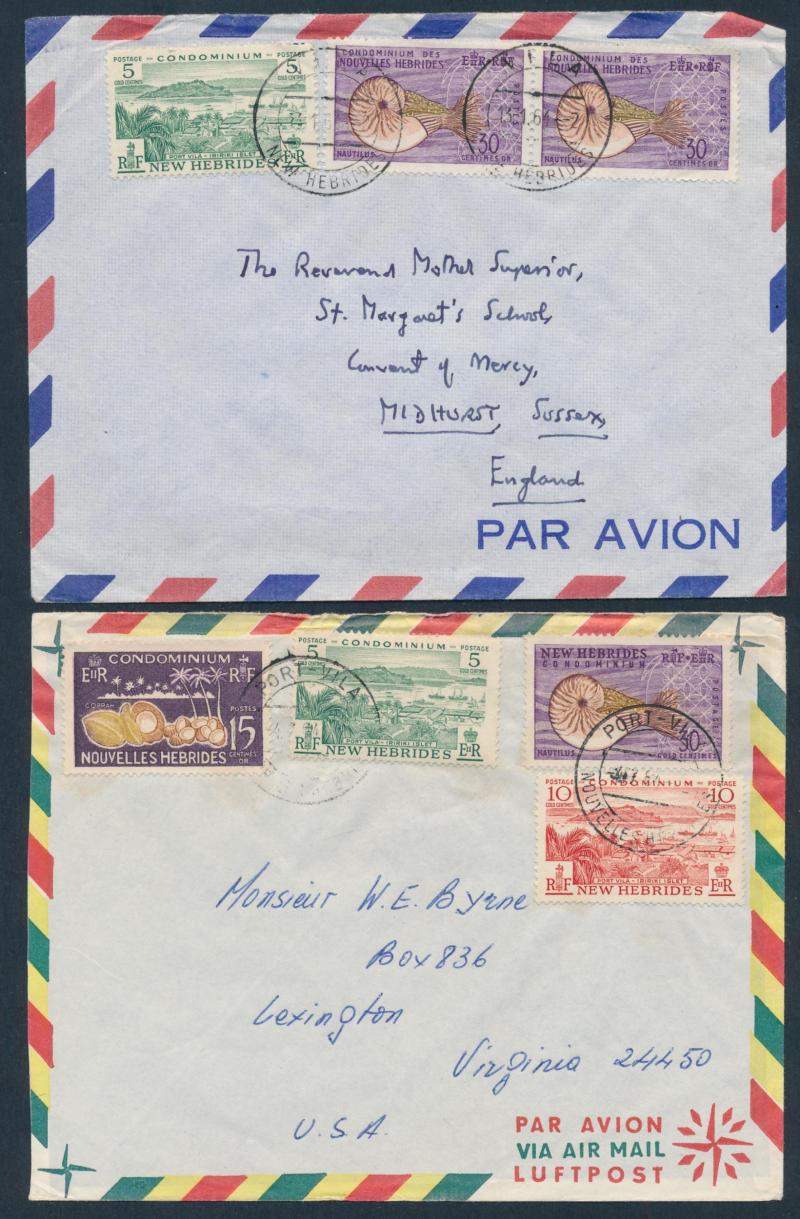 MAIL. FEE/DEFICIENT/Vila No 1 (NH)' cachet (not recorded by Ted Proud) and to USA underpaid & taxed, Aerogrammes x7 unused/CTO, a few inwards items, generally fine to very fine. A very good lot.