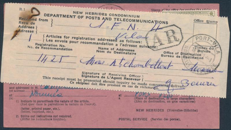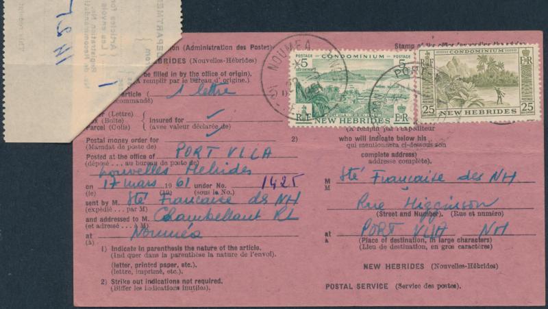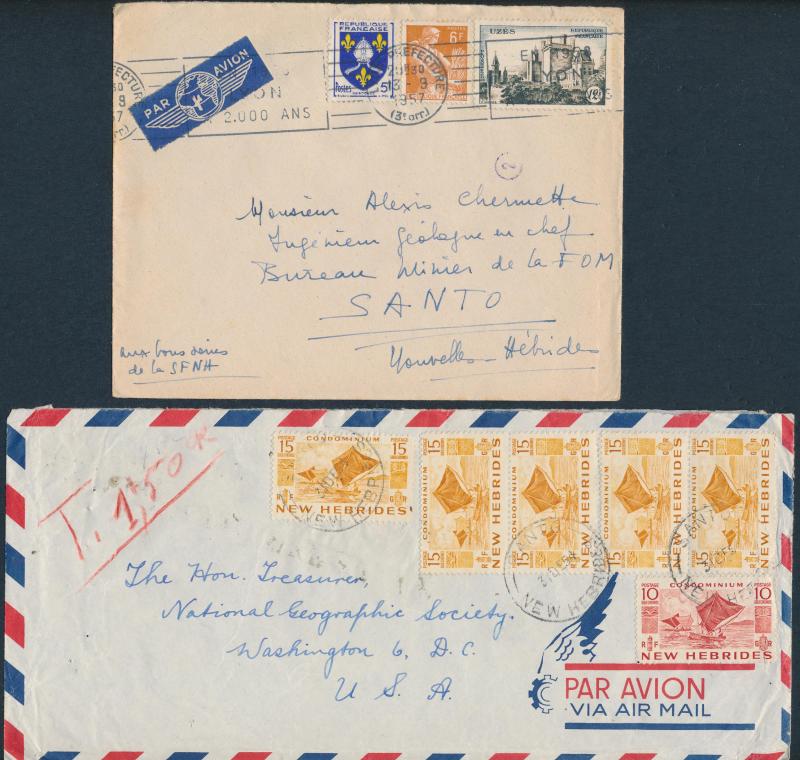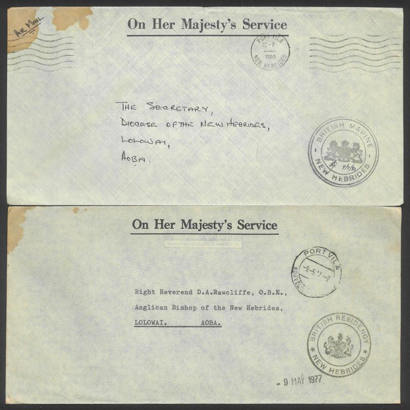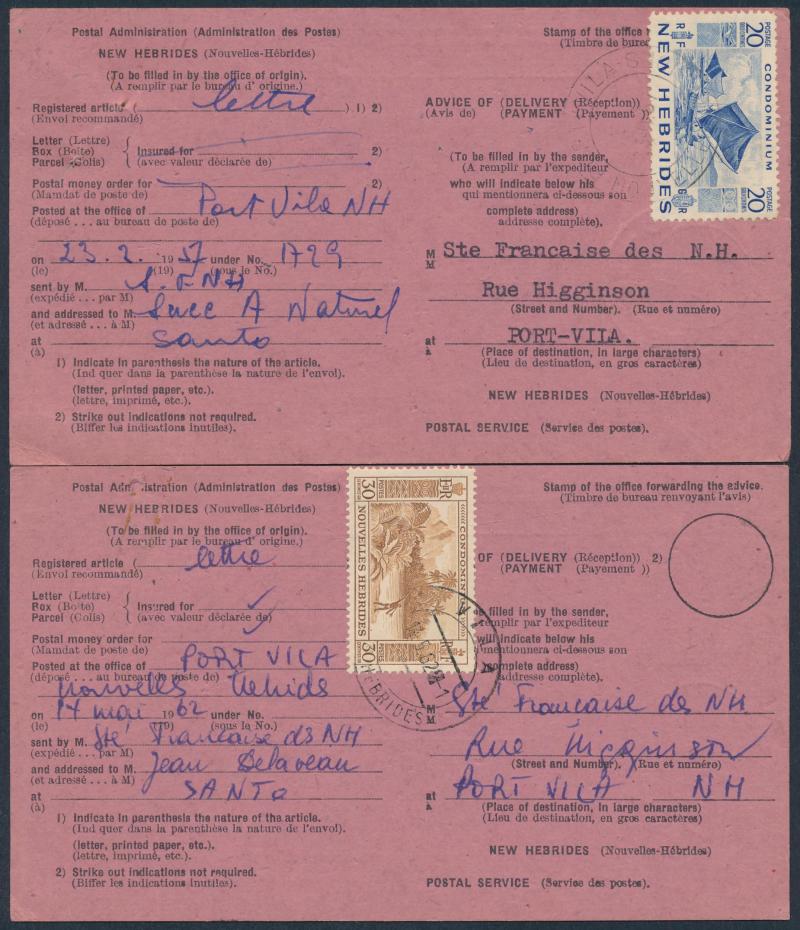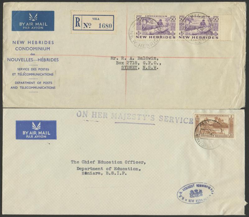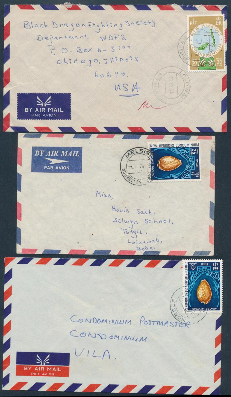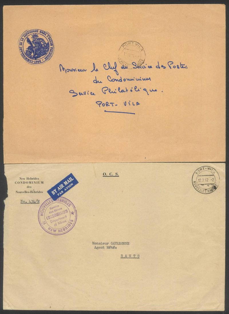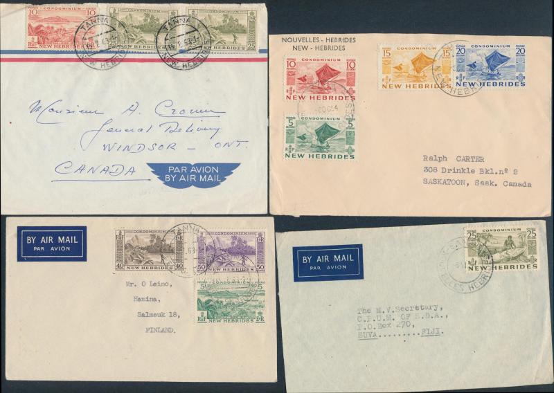 MAIL. FEE/DEFICIENT/Vila No 1 (NH)' cachet (not recorded by Ted Proud) and to USA underpaid & taxed, Aerogrammes x7 unused/CTO, a few inwards items, generally fine to very fine. A very good lot.