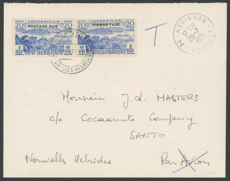 1971 apparently social/commercial stampless cover from France with "Par Avion" scored-out, to "Cocoanuts Company/Santo" with