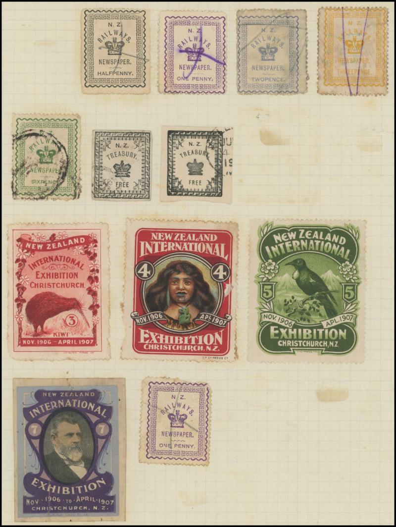 Pre-WWII accumulation including 1906 Christchurch Exhibition set * plus publicity labels x4, used on pages from QV First Sidefaces