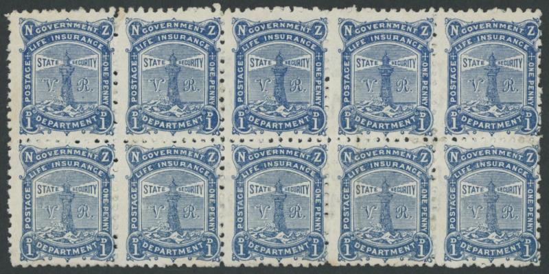 LIFE INSURANCE: 1902-04 Lighthouse with 'VR'-in-design NZ/Star 'Single' Watermark Sideways Perf 11 1d blue SG L17 block of 10