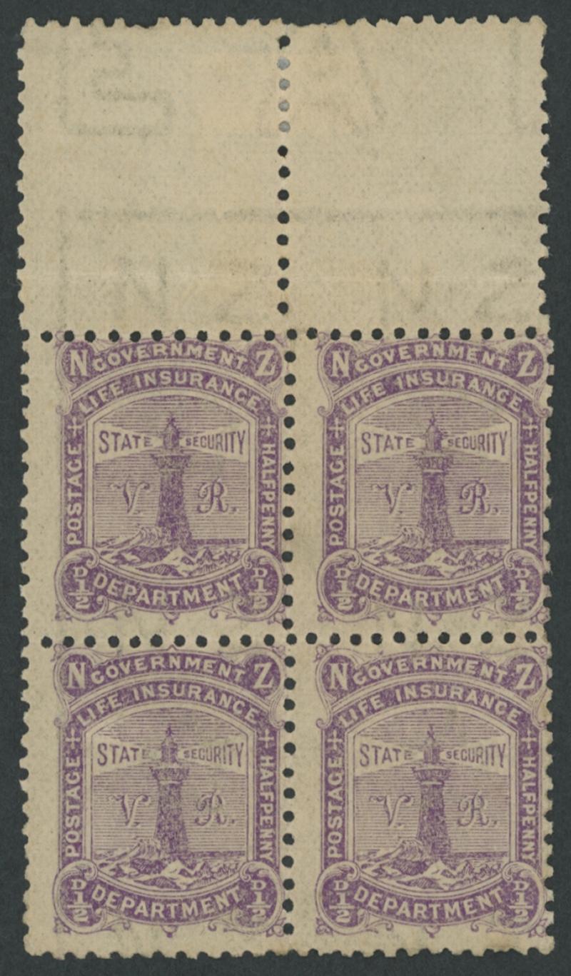 LIFE INSURANCE: 1891-98 Lighthouse with 'VR'-in-design NZ/Star Watermark Type 12c Perf 12x11½ ½d purple SG L1 block of 4 from the